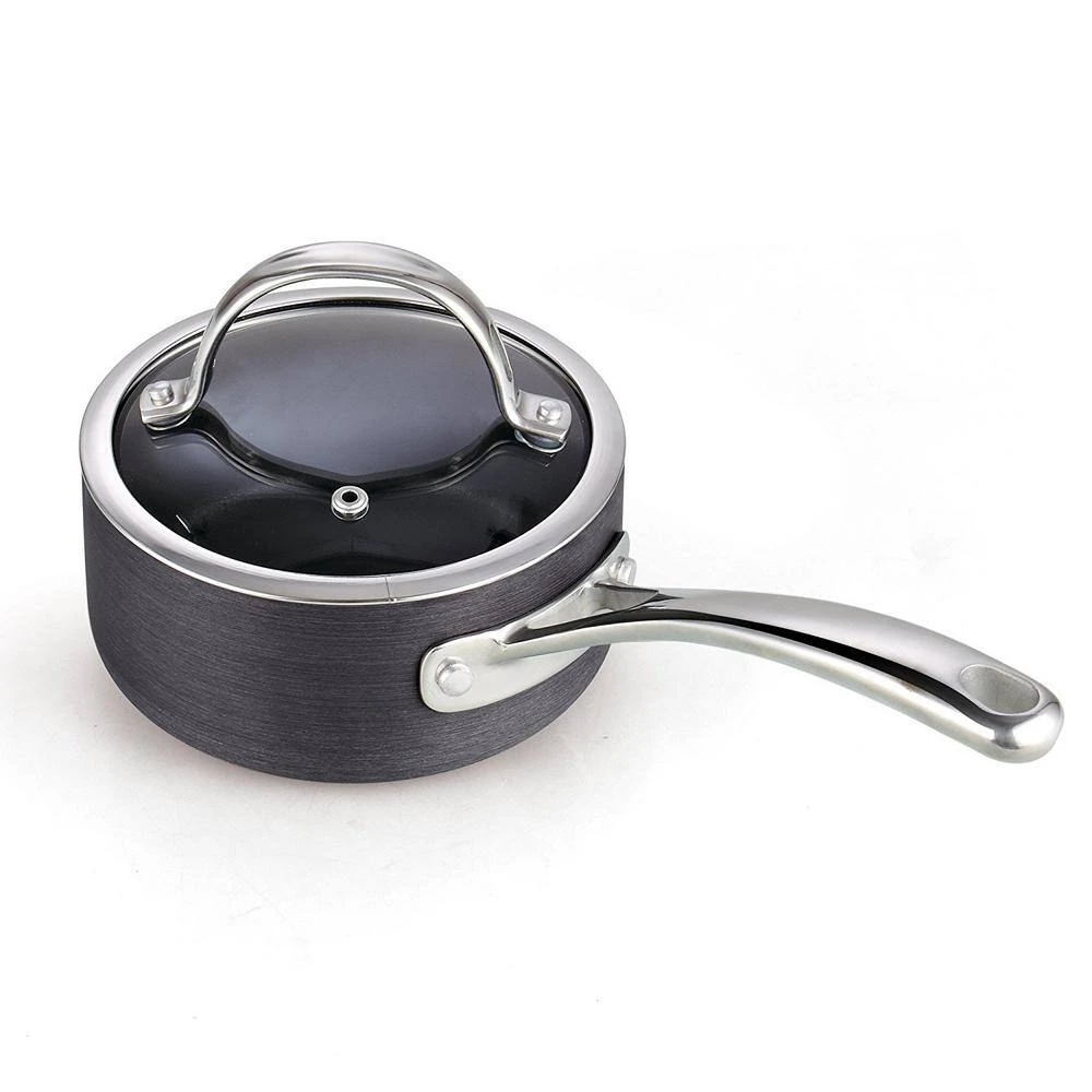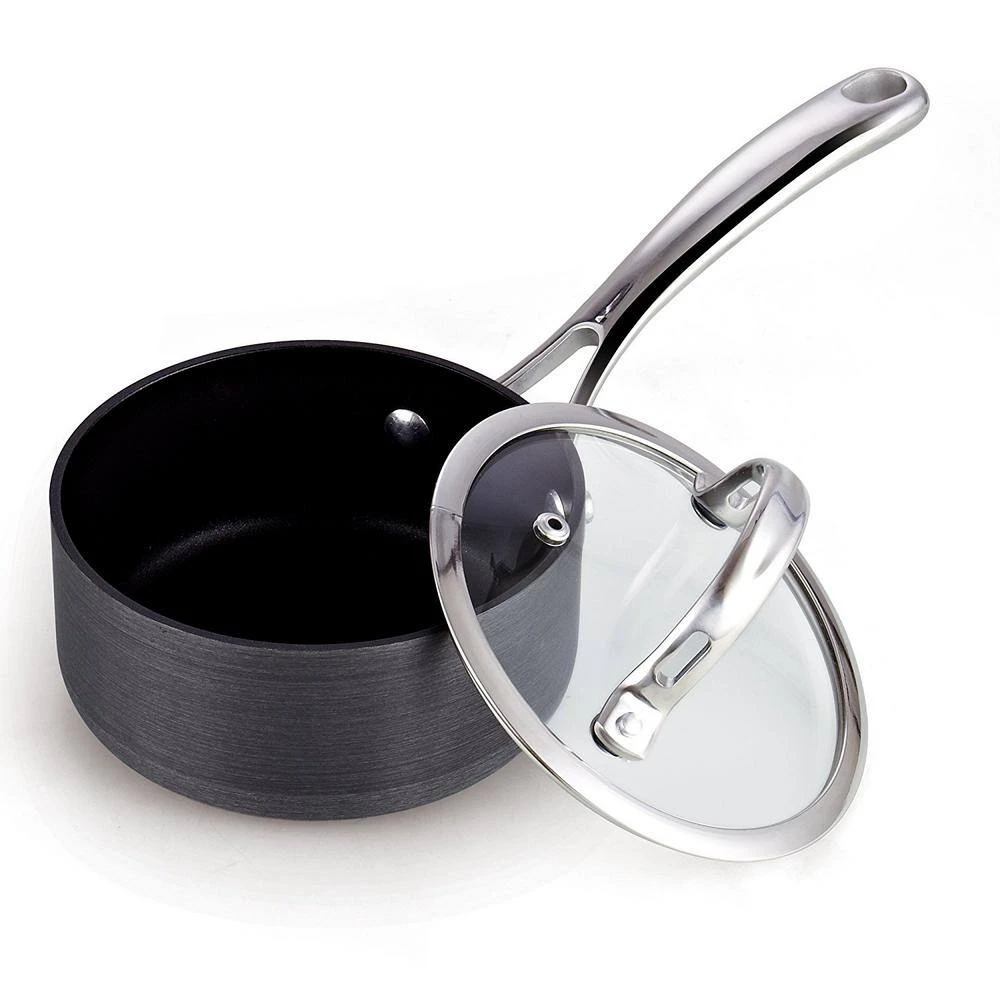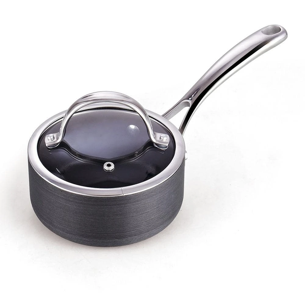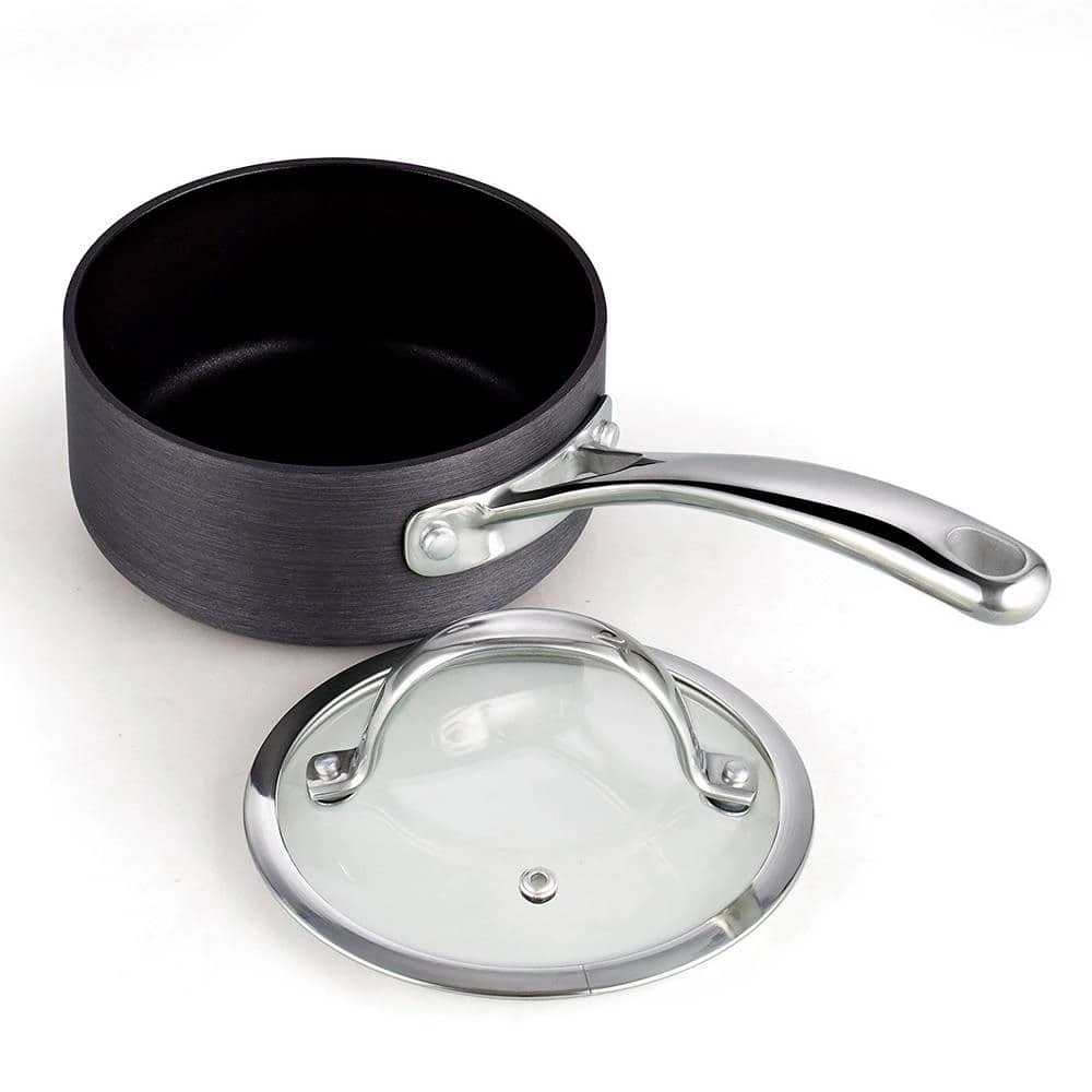 The Cooks Standard 1 Qt. Nonstick Hard Anodized Saucepan with Lid has a hard anodized surface is harder than stainless steel, dense, and chip-resistant. The Heavy-Gauge aluminum core provides even heat distribution and prevents hot spots. Nonstick delivers exceptional performance, makes food release/cleaning easy, and allows for healthy cooking. Tempered glass lid with steam vent is protected by a stainless steel rim. Riveted stainless steel handle for strength stays cool and comfortable. Not Induction compatible. Works on gas, electric, glass, ceramic, halogen, etc. Oven safe to 450°F, glass lid is not oven safe. Hand wash recommended, not dishwasher safe.