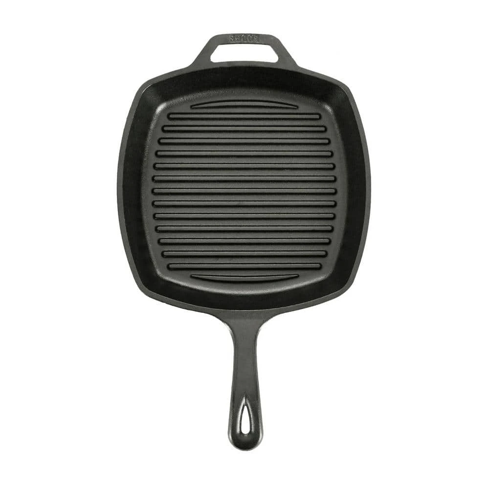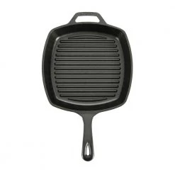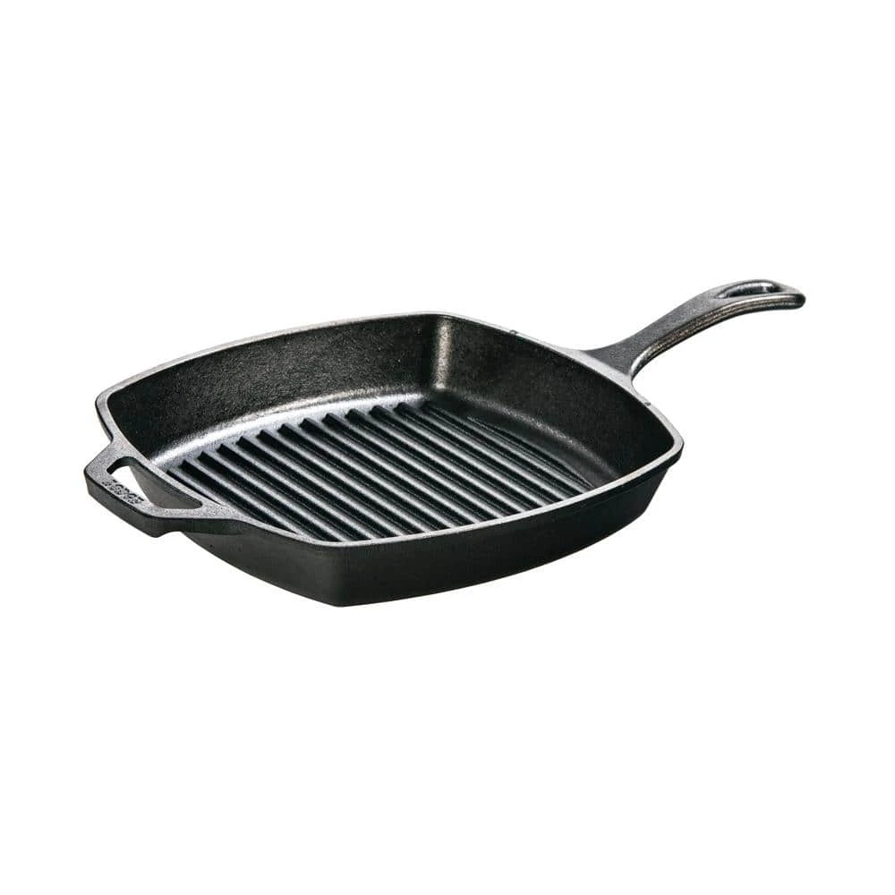 Seasoned 10.5 in. Square Cast Iron Grill Pan with assist handle. The ribs of the Lodge square grill pan allows fats to drain from foods while also searing tantalizing grill marks onto meats and vegetables. The griddle is at home in the oven, on the stove, on the grill or over the camp fire. Get mouth-watering grill marks and fantastic seared flavor at home. Grill and serve directly to the table with one magical pan. Crafted in America with iron and oil, its naturally seasoned cooking surface is ready to help you create tasty moments. Seasoned and ready to use.