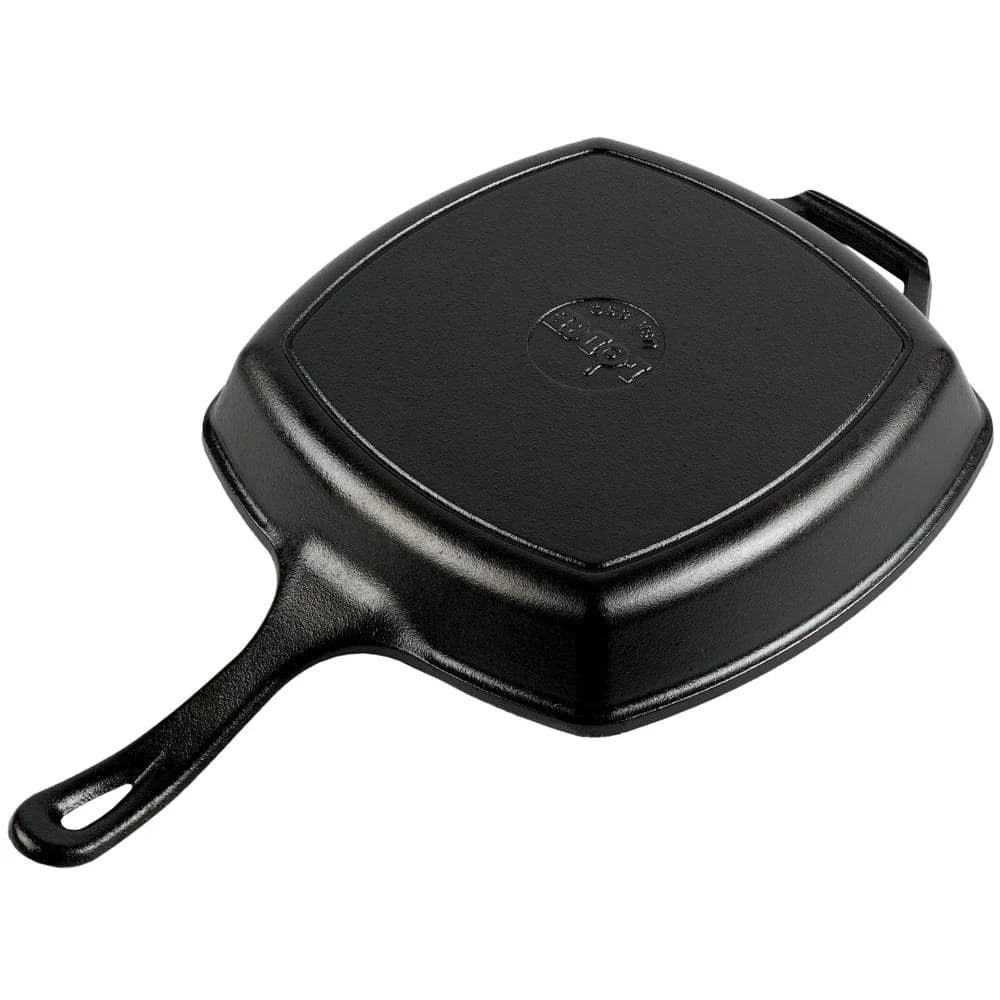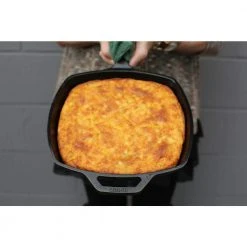 The Lodge 10.5 in. square skillet is beautifully designed and offers more cooking surface than a traditional round pan for even more superior searing. Unparalleled in heat retention and even heating. Foundry seasoned cast iron.