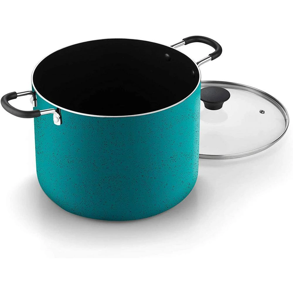 The Cook N Home 10. 5 quart nonstick stockpot with lid is made of thick gauge aluminum that provides even heat conduction and prevents hot spots. Nonstick coating Black interior makes food release and cleaning easy. Pfoa, cadmium, and lead-free. Stay-cool handles are comfortable and are riveted for strength and durability. Tempered glass lid with steam vent makes viewing food easy from start to finish. Induction compatible. Works on gas, electric, glass, halogen, etc. Oven safe to 350F. Dishwasher safe.