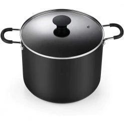 The Cook N Home 10. 5 qt. nonstick stockpot with lid, Black is made of thick gauge aluminum that provides even heat conduction and prevents hot spots. Nonstick coating Black interior makes food release and cleaning easy. Pfoa, cadmium, and lead-free. Stay-cool handles are comfortable and are riveted for strength and durability. Tempered glass lid with steam vent makes viewing food easy from start to finish. Induction compatible. Works on gas, electric, glass, halogen, etc. Oven safe to 350F. Dishwasher safe.