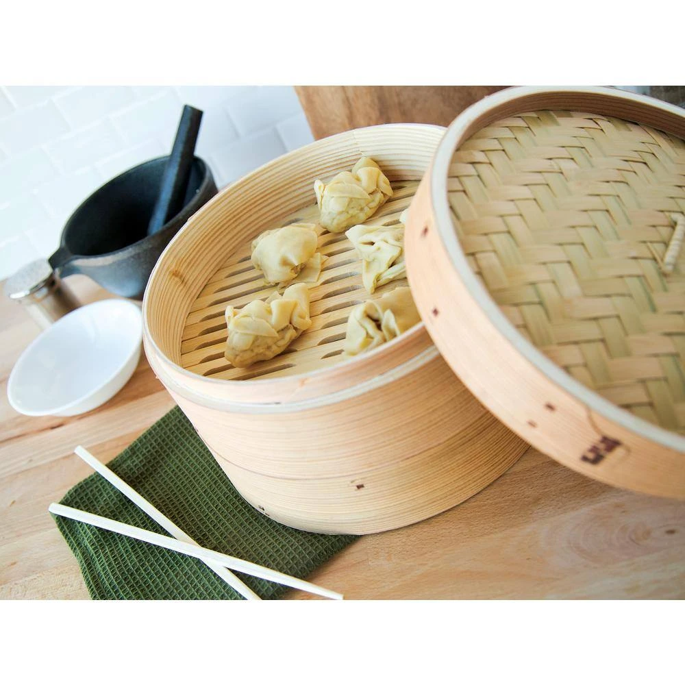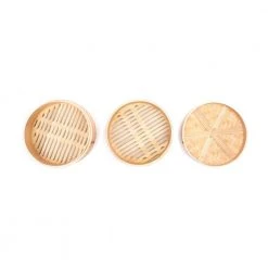This Bamboo Steamer is a must have for all lovers of Asian cooking. The steamer is made of bamboo and allows you to steam foods the traditional and healthy way. Steaming in this three piece steamer retains food’s natural flavors, vitamins and nutrients better than any other method. Designed with two tiers for steaming a variety of foods, such as meats or pre-cooked grains, all at the same time Ideal for vegetables and seafood or can even be used as a serving piece for pastries and bread. Maximize the delicious taste and vibrant colors of your favorite veggies and fish with this bamboo steamer.