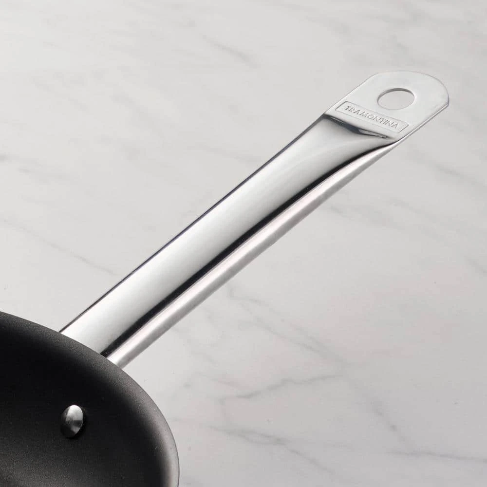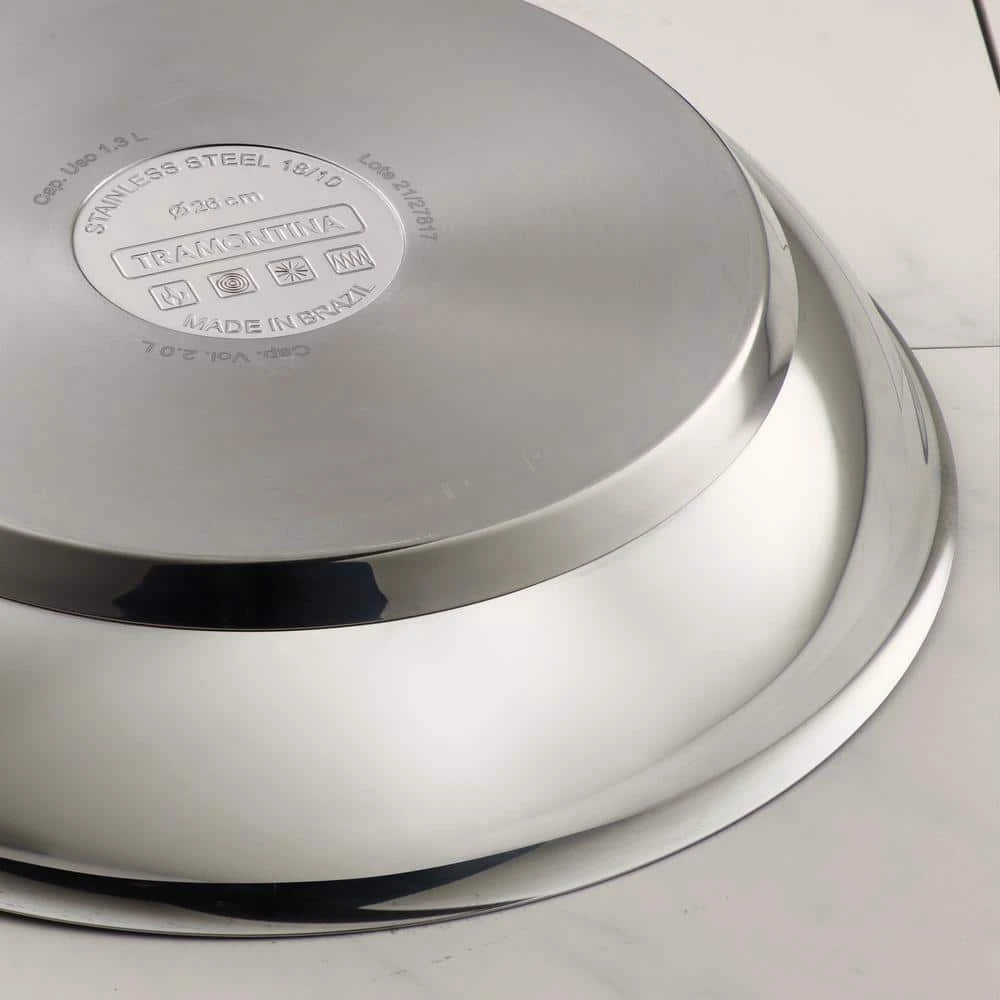 Perfect for everything from making pancakes for the kids to searing fajita meat for date night, our 10 in Tri-Ply Base Nonstick Induction-Ready Fry Pan will help you make a variety of scrumptious, hot meals. The pan’s unique Tri-Ply base construction consists of a layer of aluminum between two layers of stainless steel, allowing for the even distribution of heat and quick, uniform cooking. The mirror-polished exterior finish will bring a sleek look to your kitchen, while the nonstick interior finish, made without PFOA, makes cleanup fast and easy. The riveted stainless steel side and lid handles are sturdy and built to last, allowing cooks to carry the heartiest of dishes without worrying about spills. This item is compatible with gas, induction, electric, and ceramic glass cooktops, is oven-safe up to 450° F / 232° C, and is dishwasher-safe. Our 10 in Tri-Ply Base Nonstick Induction-Ready Fry Pan is made in Brazil and comes with a lifetime warranty.