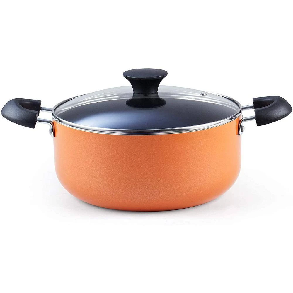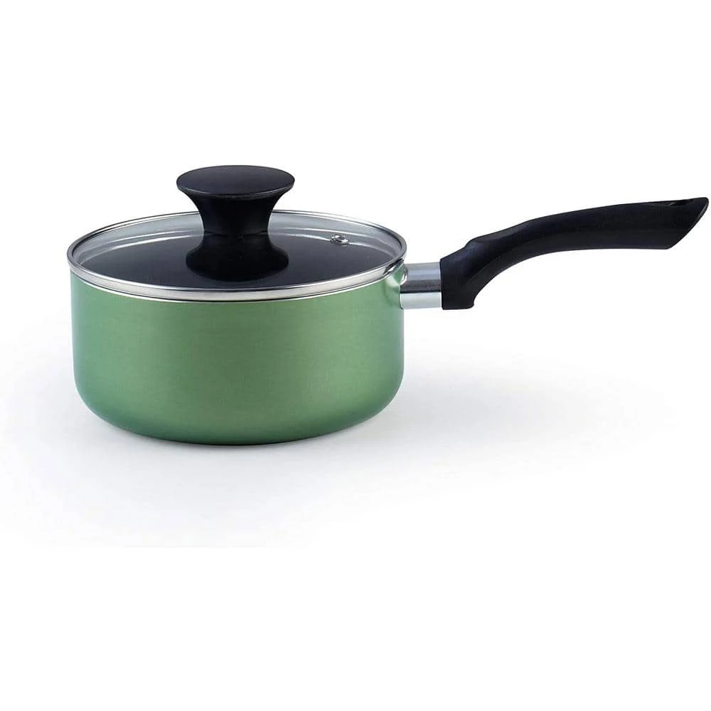 The Cook N Home 10-Piece Nonstick Stay Cool Handle Cookware Set, Multicolor includes: 1 and 2 qt. saucepans with lids, 5 qt. dutch oven with lid, 8 and 9.5 in. fry pans, nylon spatula, and nylon spoon. The cookware is made of thick gauge aluminum that provides even/quick heat conduction and prevents hot spots. Nonstick makes food release/cleaning easy and allows for healthy cooking. Riveted comfortable handles stay cool while cooking and has a hole for hanging. Tempered glass lids with steam vent makes viewing food easy, keeps heat/moisture in, and fits on fry pans. Utensils with guard are durable for mixing, moving, and transferring foods. Not Induction compatible. Works on gas, electric, glass, ceramic, halogen, etc. Oven safe to 350F. Dishwasher safe.