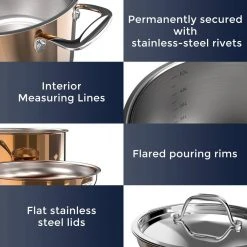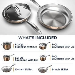 - 2-quart saucepan with lid, 3-quart saucepan with lid, 3.2-quart saucepan with lid, 6.2-quart stockpot with lid, 8-inch skillet, 10-inch skillet