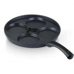 The Cook N Home Nonstick Marble coating 4 egg fry pan is made of fine grade aluminum that provides even heat conduction and prevents hot spots. Nonstick marble coating makes food release/cleaning easy and allows for healthy cooking. Die-cast aluminum is break resistant and does not warp. Lightweight for tossing and flipping foods. Handle stays cool and comfortable while cooking also has a hole for hanging. Works on gas, electric, glass, ceramic, halogen, etc. Not Induction compatible and not oven safe. Dishwasher safe, hand wash recommended for longer life span. Do not use with metal utensils.