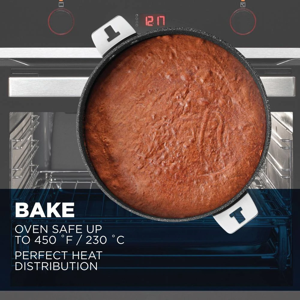 THE ROCK by Starfrit 11 in. Fry Pan/Round Dish with T-Lock Detachable Handle will help you save storage space. The T-Lock system means the handle can be removed for storage and reattached once the pan emerges from the oven or dishwasher. And not only does the T-Lock system save up to 40% in storage space by eliminating the awkward handle, it can be used with or without the handle, from cooktop or oven to table. Plus, this pan uses the same surface treatment and nonstick coating that makes THE ROCK so unique.