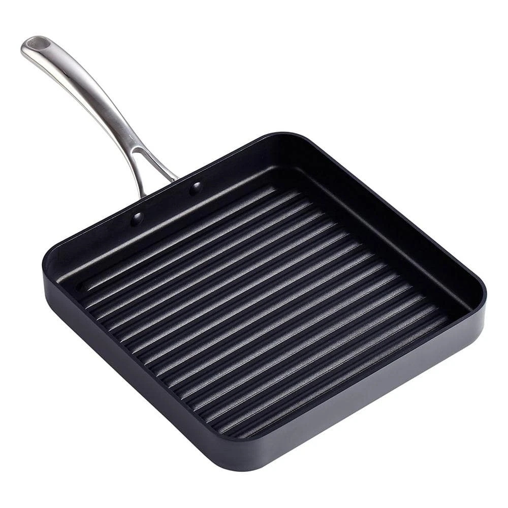 The Cooks Standard 11 in. Nonstick Hard Anodized Deep Square Grill Pan has a hard anodized surface that is durable and harder than stainless steel. The Heavy-Gauge aluminum core distributes heat evenly and prevents hot spots. Nonstick coating delivers exceptional performance and makes cleaning easy. Lead, cadmium, and PFOA free. Stainless steel handle stays cool and is riveted for strength. Ridges for grill marks/browning and allows for oil/fat to drip down. Deep walls hold a large amount of fodd and prevents splatters. Works on gas, electric, glass, ceramic, halogen, etc. Oven safe to 500°F. Not Induction compatible. Dishwasher safe, hand wash recommended.