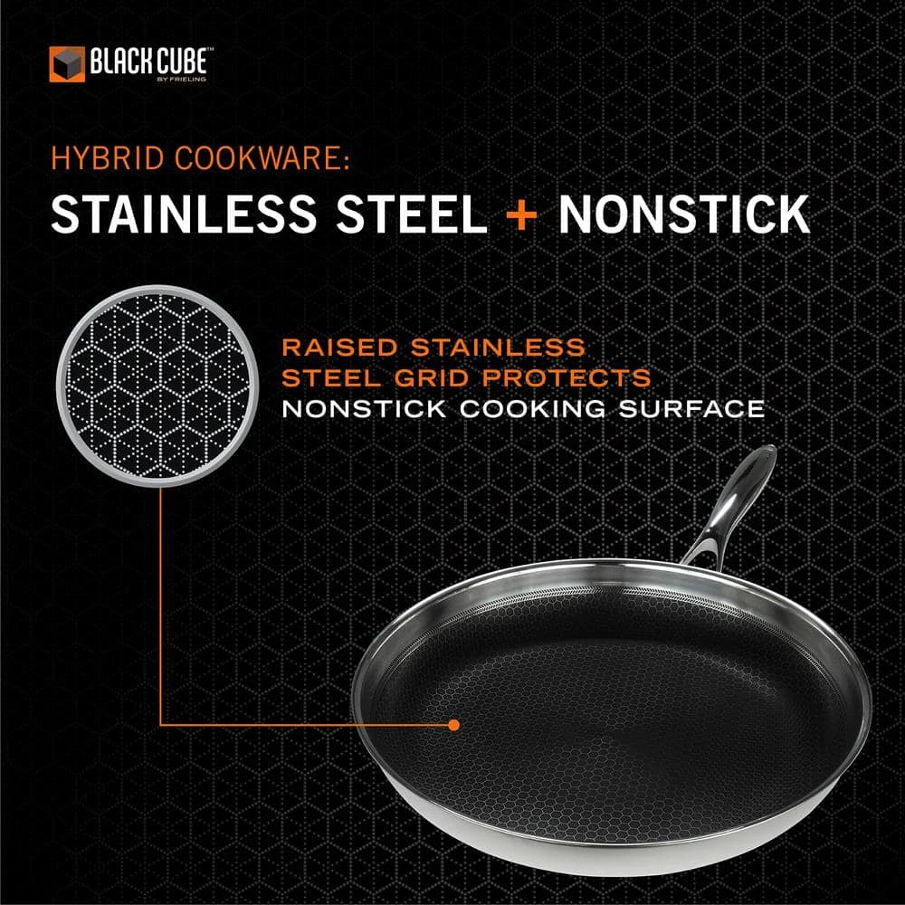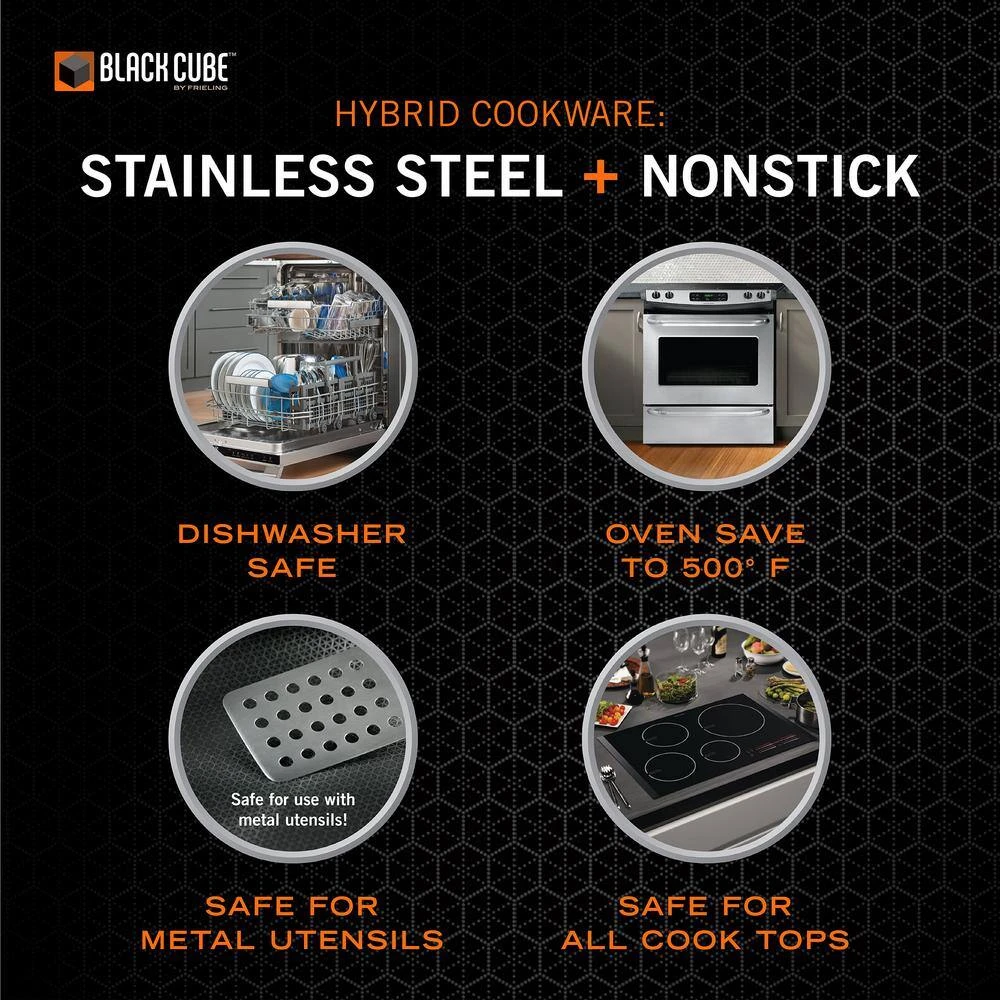 Yes, you can have it all in one pan. Black Cube features a textured surface for superior browning that is easy to clean. All the benefits of stainless steel and nonstick – no compromise. This is the world’s first hybrid cookware with the ultimate cooking surface: cooks like stainless steel and cleans like nonstick.