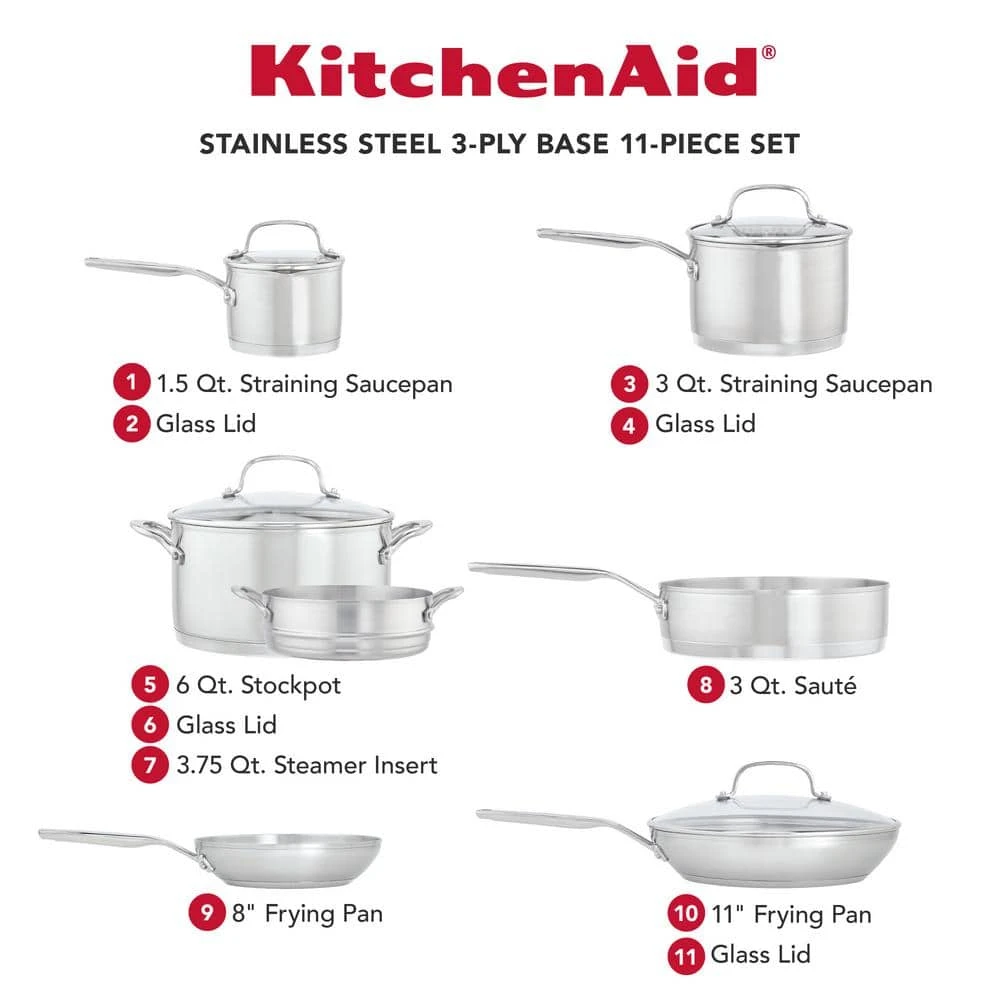 Experiment with and discover new flavors and techniques when cooking with 3-Ply Base Stainless Steel Cookware, designed with an extra thick layer of heat-conducting aluminum to eliminate hot spots by distributing heat evenly from edge to edge. Heavy-gauge stainless steel pots and pans feature a heavy bottom base for lasting durability, and the stockpot and saucepans have etched measuring marks to explore and test ingredients for new recipes. Tempered glass lids have built-in straining rims to lock in heat and flavor while also serving to strain liquids. Curious cooks can investigate a wider range of recipes in the broiler and oven, where cookware is safe to 500°F, 350°F with lids.