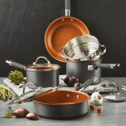 - Fast, even heating: tough hard-anodized aluminum pots and pans for first-rate fusion of durability and heat conductivity