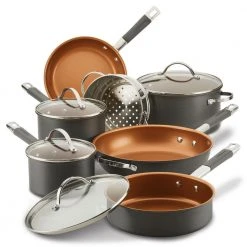“Reach for the long lasting durability and superior ceramic nonstick features of the Farberware Glide Pro Hard Anodized 12-Piece Cookware Set with Copper Ceramic Nonstick. This essential collection of saucepans, skillets, and a stockpot and saute pan are constructed from ultra tough hard anodized aluminum, and feature high quality CopperSlide technology for effortless nonstick food release and easy cleanup of even the stickiest recipes like honey sticky ribs or a weekend cheddar omelet. Snug fitting glass lids seal in heat and flavor, and the stainless steel and silicone grip easy hold handles provide a comfort and confidence to flip, fry, and saute with ease. Oven safe to 400°F for stove to oven versatility, the pans are backed by Farberware’s hassle free, no worries lifetime warranty. For great performance and long lasting durability, reach for the Farberware Glide Pro Hard Anodized 12-Piece Cookware Set with Copper Ceramic Nonstick”.