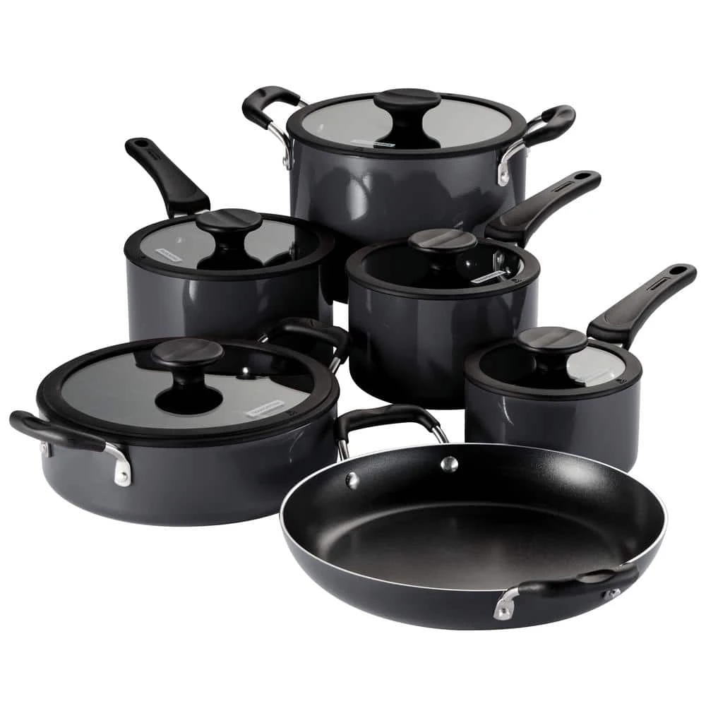 We’ve thought of just about everything to make your cooking, cleaning, and organizing experience better in the kitchen. The Tramontina Nesting 11-piece Cookware Set will revolutionize your cooking and your storage space. The pieces in this dependable set lock together, and nest within each other-leaving you with 50% more cupboard space. Made of heavy-gauge aluminum, the high-performing set features a porcelain enamel exterior finish. You can feel comfortable preparing family dishes with our Nesting Cookware Set. We’ve paired the porcelain enamel exterior with an easy-release nonstick interior that is made without PFOA, lead, or cadmium. This makes it strong enough to handle your busy kitchen and your heartiest recipes-all with the low-maintenance durability you count on from Tramontina. Keep an eye on your sauces and soup through heat- and shatter-resistant tempered glass lids and say goodbye to trails of sauce across your counter tops. These lids also feature a unique (and convenient) knob that serves as a spoon rest. We didn’t stop there. Ergonomically designed, riveted handles also help save storage space, as well as, the life of the set, by locking together and spacing the vessels apart, to protect the nonstick surface from getting scratched when tucked away in your cupboards and when it’s all about the cleaning, this set makes that a breeze as well. It’s easy to clean and dishwasher-safe. Available in a variety of colors.