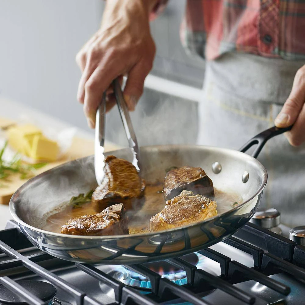 Build layers of flavor with the 5-Ply Clad Stainless Steel Frying Pan designed for precision cooking with exceptional base-to-rim heat conduction. Crafted from 5-layers of heat conductive metal throughout, this heavy-gauge skillet is built to fuel endless possibilities in the kitchen while providing superior heat retention. Unique black stainless steel handles are dual-riveted and provide a sleek table top presentation. Sealed rims prevent corrosion, allowing for frying pan to be truly dishwasher safe. Broiler and oven safe to 500°F for versatility, freedom, and creative cooking.