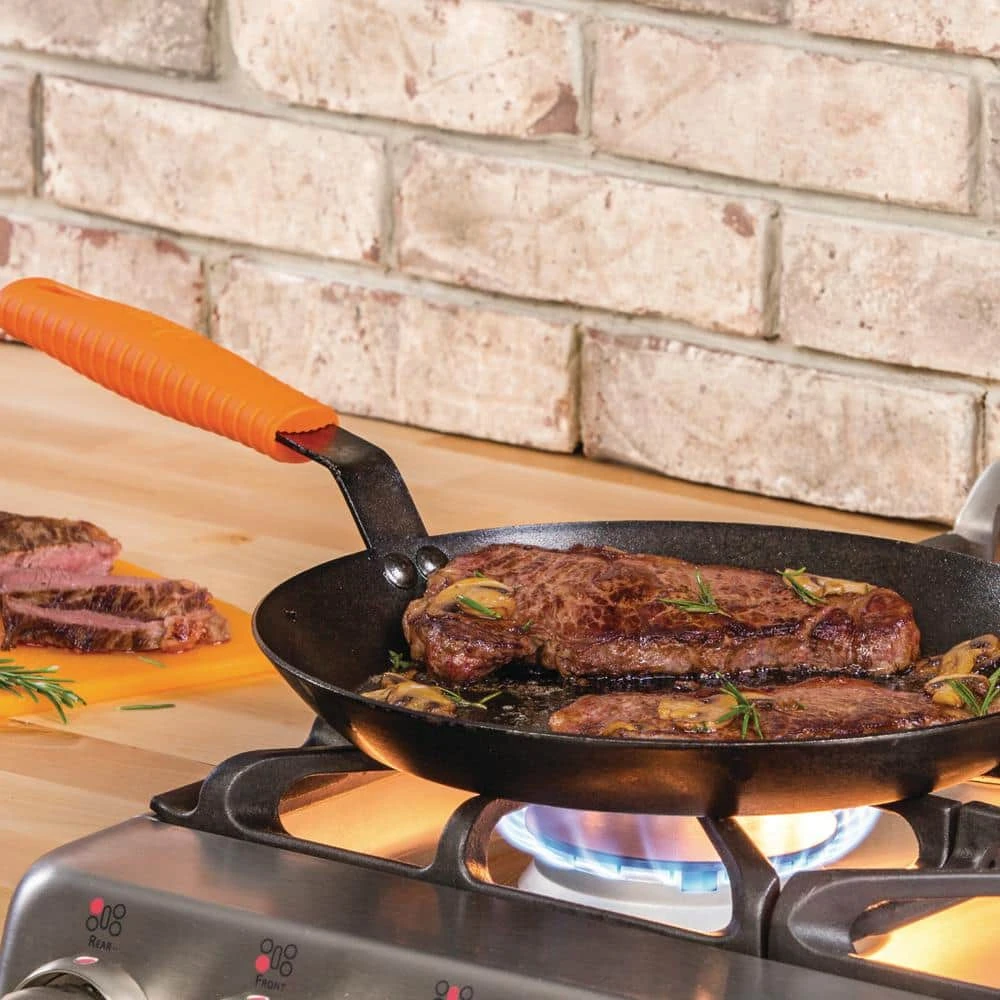 Seasoned 12 in. Carbon Steel Skillet with orange silicone hot handle holders. Big enough to sear multiple steaks or toss a ton of pasta, it’s sure to please a crowd. Carbon steel has always been preferred by professional kitchens.