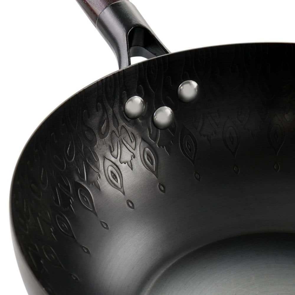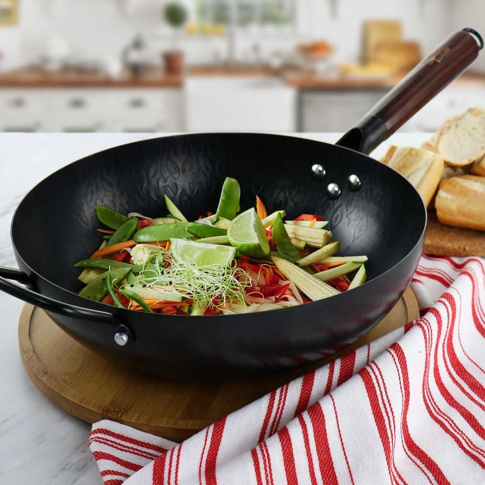 Cook your favorite recipes evenly and perfectly with the 12 in. carbon steel wok by Tia Mowry. This designer wok is ideal for stir frying, steaming, or boiling. Embossed side details and wooden handle add a flair of fashion to your cooking experience while the carbon steel construction is long-lasting and durable. This pan will soon become your go to for large dishes and family meals. Hand wash only.