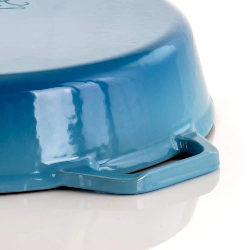 The MegaChef Round 12 in. Enamel Cast Iron Skillet allows any home chef to create their best meals. Made of non-stick enameled cast iron f or healthier meals by allowing cooks to cut down on oils and fats. This col orful frying pan provides the user with 2-pouring spouts to better spread delicious sauces over dishes. The durable cast iron material is guaranteed to last along with the outer enameled coating that protects the cookware from m ore acidic ingredients. The handle conveniently is made with a hanging hole f or easy st orage via hanging hooks. Bring col or to the kitchen with the lovely gradient displayed on the underside of the skillet. Its deep capacity allows f or saucier m orsels like fajitas and Tuscan chicken to fav orites like deep-dish pizza and lamb chops.