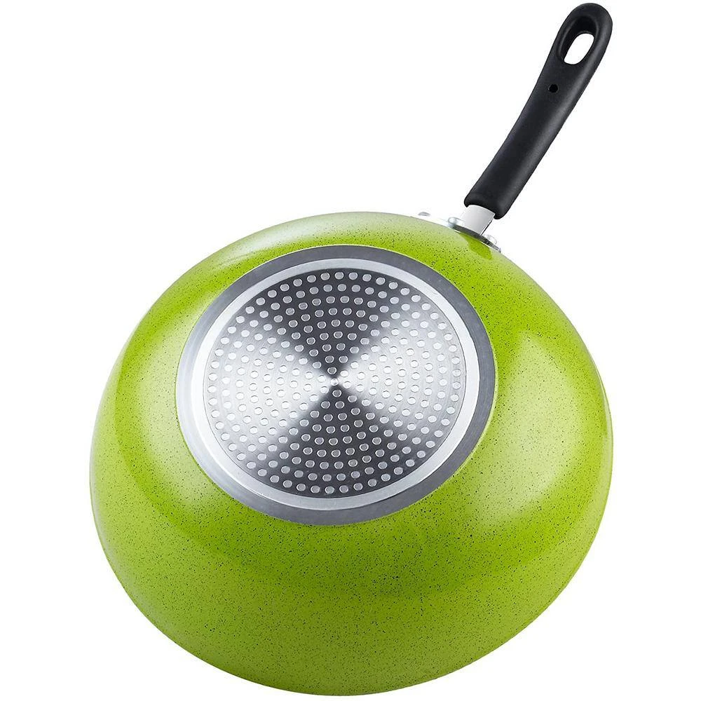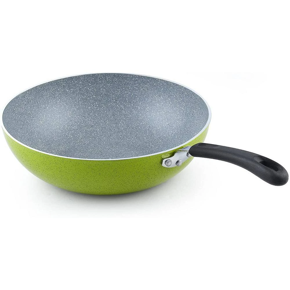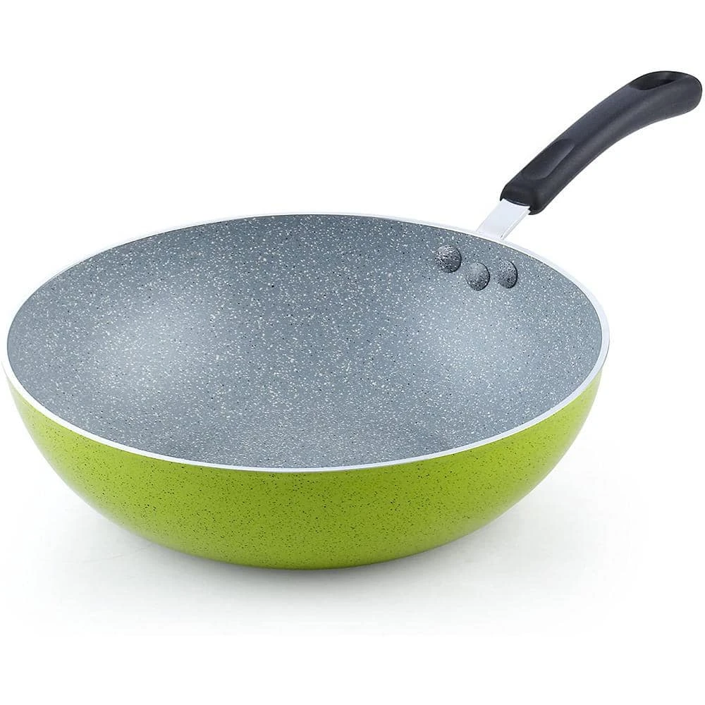 The Cook N Home 12-Inch Nonstick Stir Fry Wok Pan, Green Marble Pattern, 30cm is made of thick gauge aluminum that provides even/quick heat conduction and prevents hot spots. Nonstick makes food release, cleaning, flipping, and tossing easy and allows for healthy cooking. Coating is cadmium and lead free. Long riveted handle with hole for hanging is comfortable to hold, stays cool, and non-slip. Wide top and narrow base for multiple uses. Induction compatible and works on gas, electric, glass, ceramic, halogen, etc. Not oven safe. Dishwasher safe. Please do not use metal utensils as it may scratch the nonstick coating. Over-heating may damage nonstick coating. Putting a hot pan in cold water may reduce nonstick coating lifespan. See further details in use and care manual. Measures: 3.5 in. height, 20 in. length, and 2.75 lb.