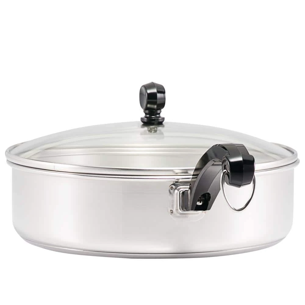 - Shatter-resistant glass lids keep heat and moisture in, and the cooking stays visible