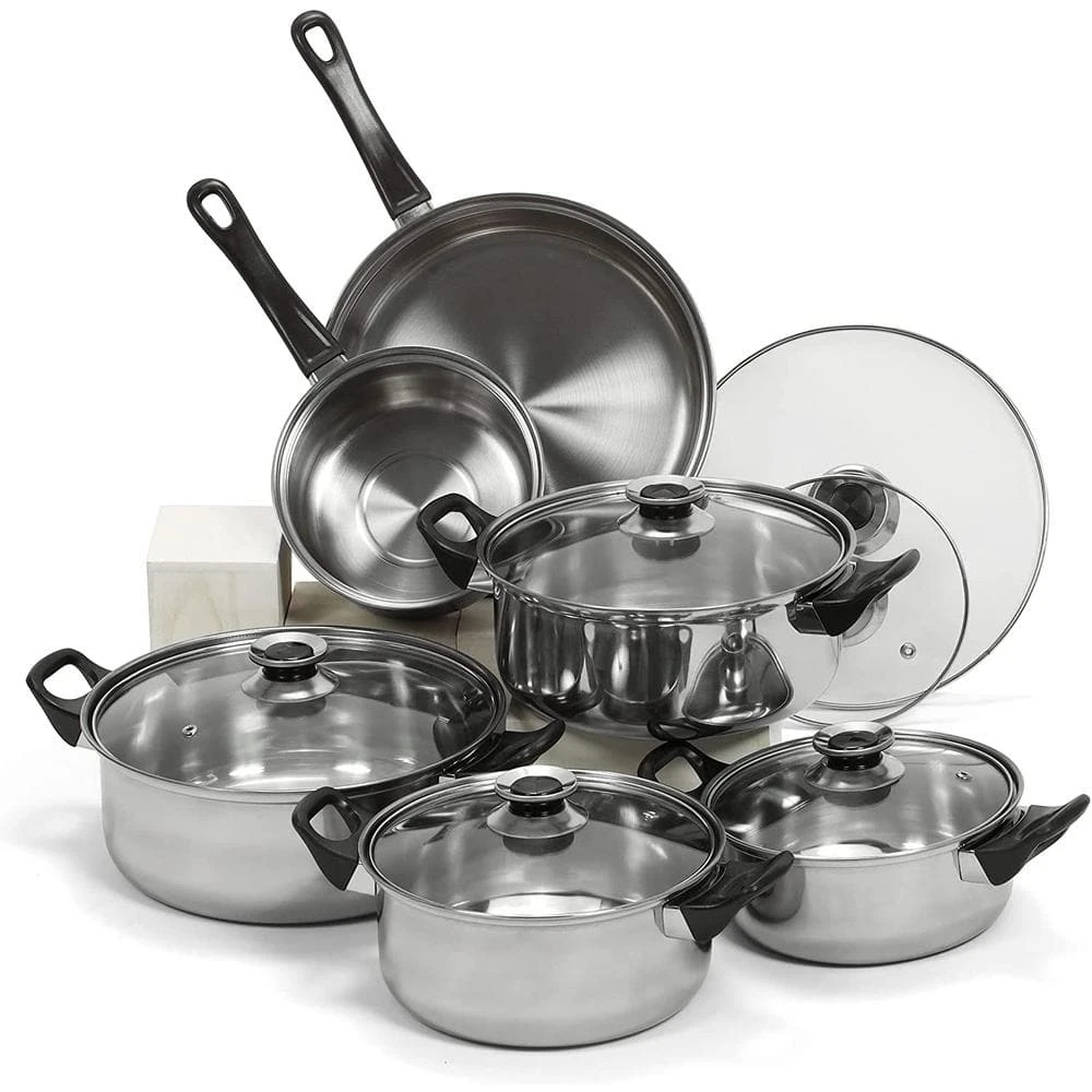 This 12 piece cookware set has a mirror finish, classic looks, professional performance and induction-read. The stainless steel cooking surface does not discolor, react with food or alter flavors. It has tempered glass lids with steam vent to view food; the riveted stainless steel handles are durable, comfortable, and wide/deep for comfortable grip.