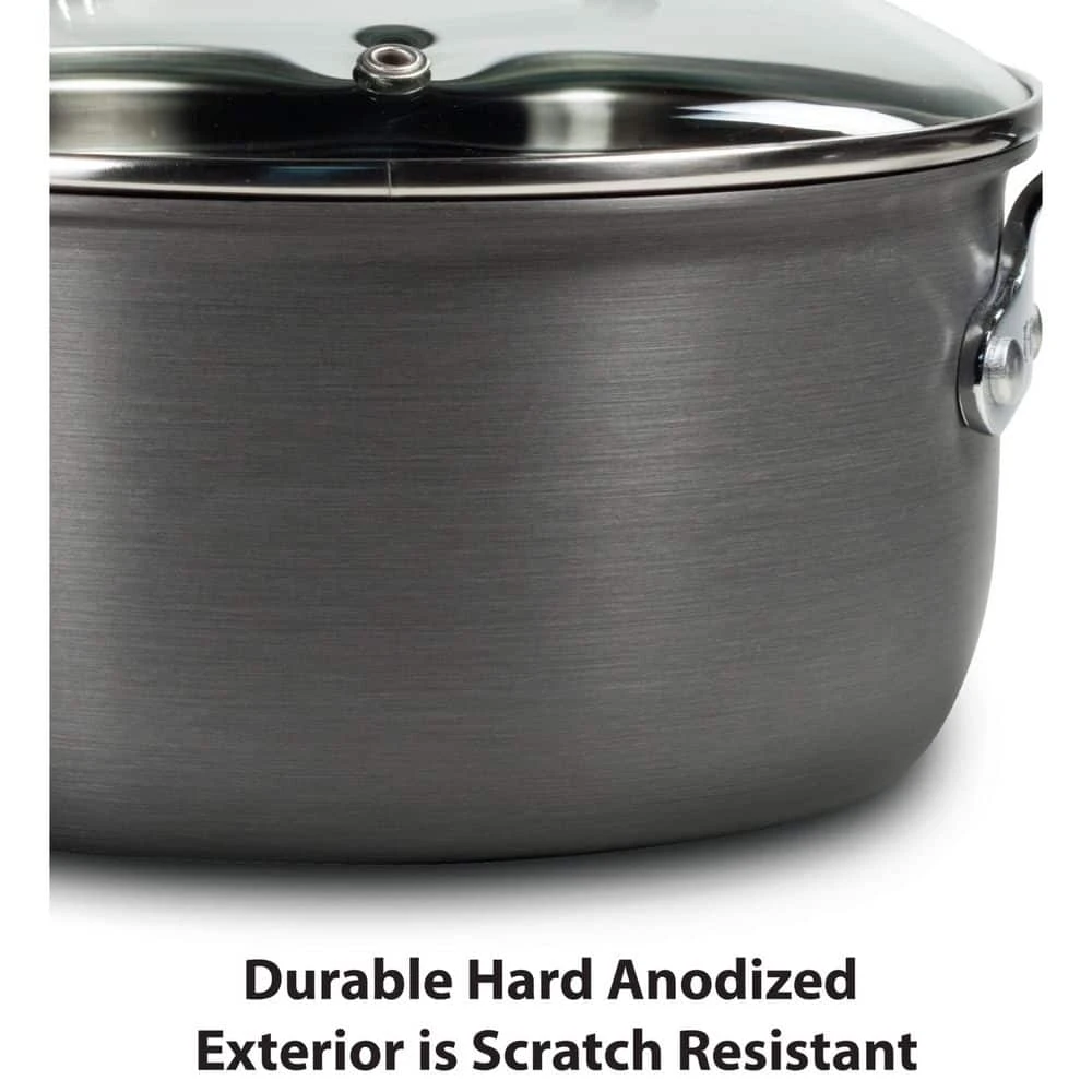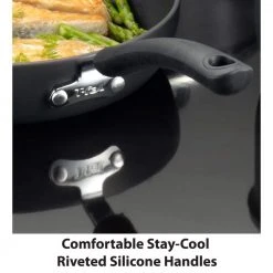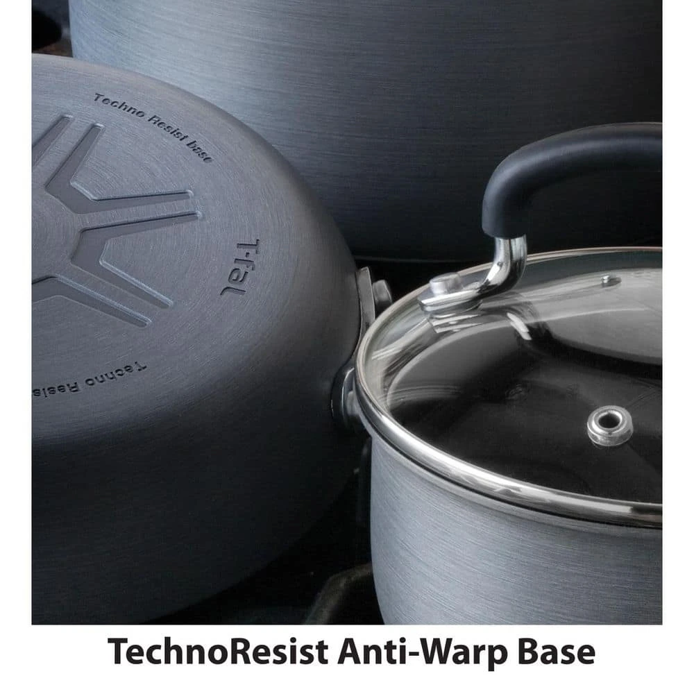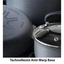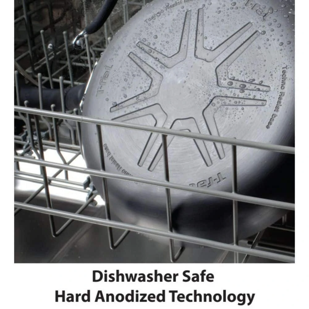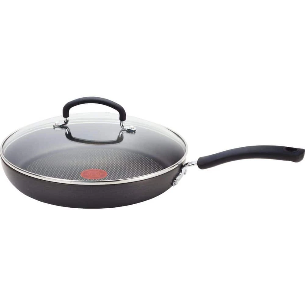 The 12 in. T-fall Ultimate Hard Anodized Deep Saute Pan is exceptionally durable and scratch resistant even safe for use with metal utensils. The Techno resist base prevents warping and provides even heat distribution. It is also dishwasher safe.