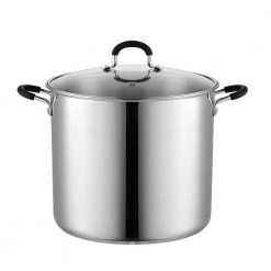 The Cook N Home 12 Qt. Stainless Steel Stockpot Saucepot with Lid is made of mirror polished 18 to 10 stainless steel for durability and easy cleaning. Aluminum disc layer in bottom for even heat distribution and prevents hot spots. Tempered glass lid with steam vent to view food while cooking. Riveted handles are comfortable and stay cool. Reinforced rim for long heating and pouring. Large size for multipurpose function and can be used for canning and jarring. Induction compatible. Works on gas, electric, glass, ceramic, halogen, etc. Oven safe to 350°F. Dishwasher safe.