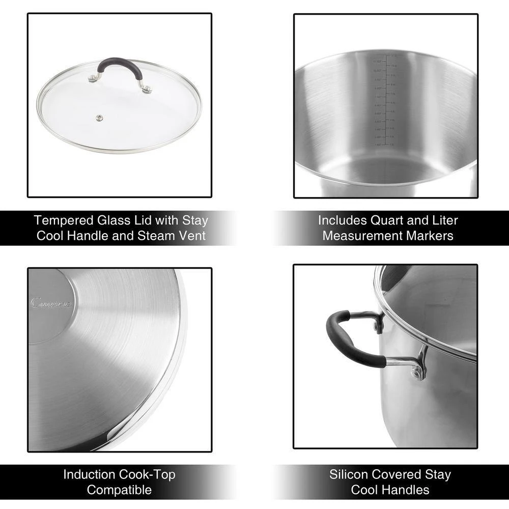 The 12 Qt. Stainless Steel Stock Pot with Lid by Classic Cuisineis essential kitchen cookware for every home chef. This stainless steel 12 Qt. pot comes with a tempered glass lid with vent hole to release excess moisture. This handy kitchen tool has measurements right on the inside of the pot, making it simple to know how much liquid you have added. The pot also features silicone coated, stay cool handles for safety and convenience. The stockpot is durable, long lasting, and safe for glass, electric, induction or gas cooktop stoves.