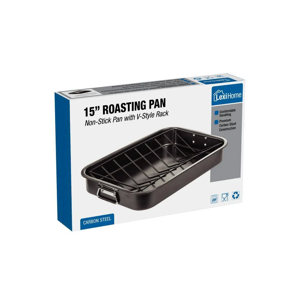 Roast your meat with this high quality end stainless steel baking pan, made from Carbon Steel and made durable for heavy-duty. It cooks evenly and beautifully with anything you roast. Perfect for baking brownies, lasagna and much more. It comes with a removable rack. It has heavy-duty riveted handles that can be folded down for easy storage. Easy to clean afterwards.