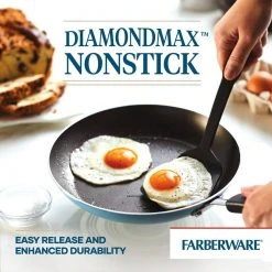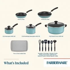 “Equip the kitchen for convenience and reliability to make great family meals with the Farberware Cookstart 15-Piece DiamondMax(tm) Nonstick Cookware Set.Farberware has brought performance, convenience and reliability to countless kitchens for over 100 years, and this set continues that tradition for a new generation. Crafted from heavy-duty aluminum for excellent heat distribution, this cookware boasts colorful exteriors and superior DiamondMax(tm) nonstick interiors that perform 3X better than ceramic nonstick for easy food release and cleanup with a distinctive look. Use the saucepans for warming soups and sauces, the skillets for browning ground beef or pork chops, and the cookie pan for roasting chicken nuggets or baking up a batch of chocolate chunk cookies. The pots and pans are oven safe to 350°F and feature comfortable handles for a confident grip. Shatter-resistant glass lids allow cooking to be monitored without losing heat or moisture, and the set includes six handy Prestige(r) nylon kitchen tools to get delicious dishes started right away. Plus, the entire set is dishwasher safe for quick, convenient cleanup. Be ready to create breakfast, lunch, and dinner every day with the convenient, essential pieces in the Farberware Cookstart 15-Piece DiamondMax(tm) Nonstick Cookware Set”.