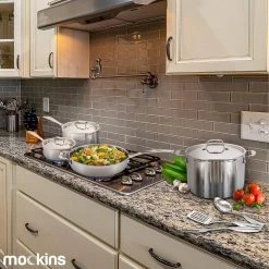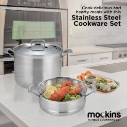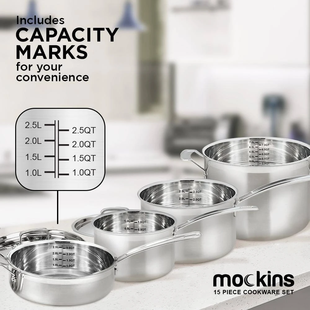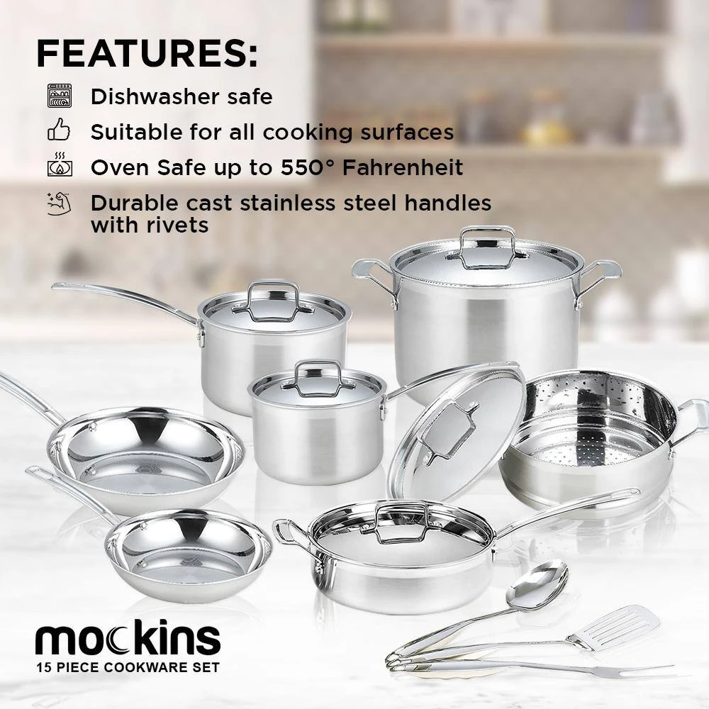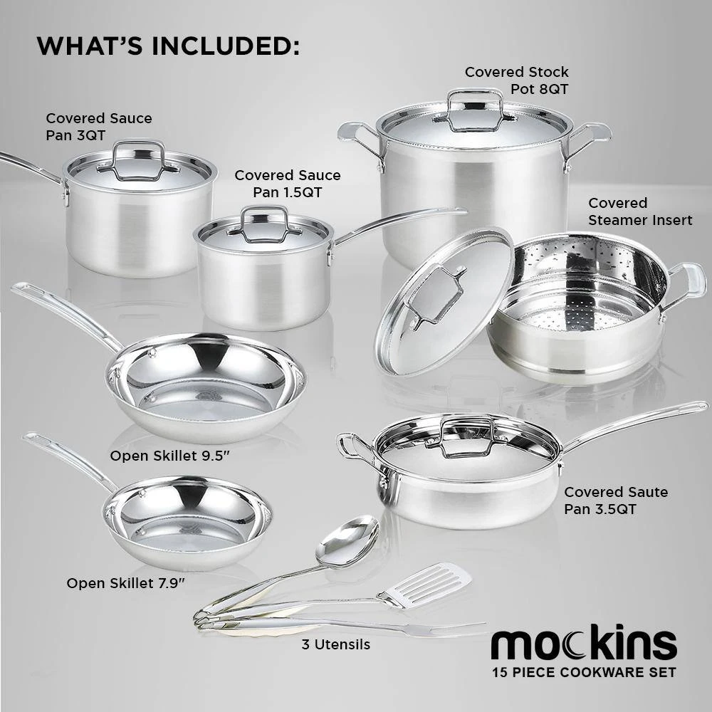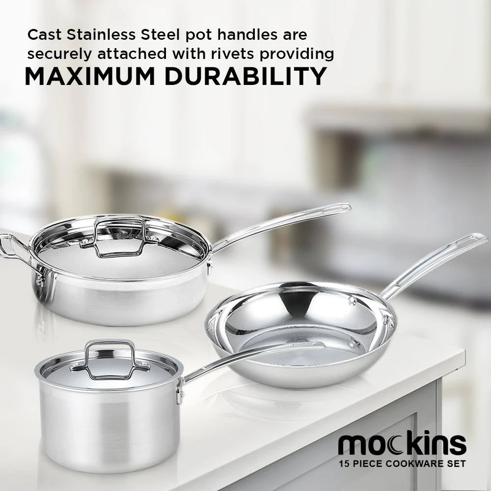 The Mockins 15-Piece Cookware Set makes for an essential addition to your kitchenware. The tri-ply body comprises an inner layer made of 18/8 commercial-grade stainless steel, pure aluminum core. The outer layer is made of induction stainless steel, which allows for even distribution of heat.