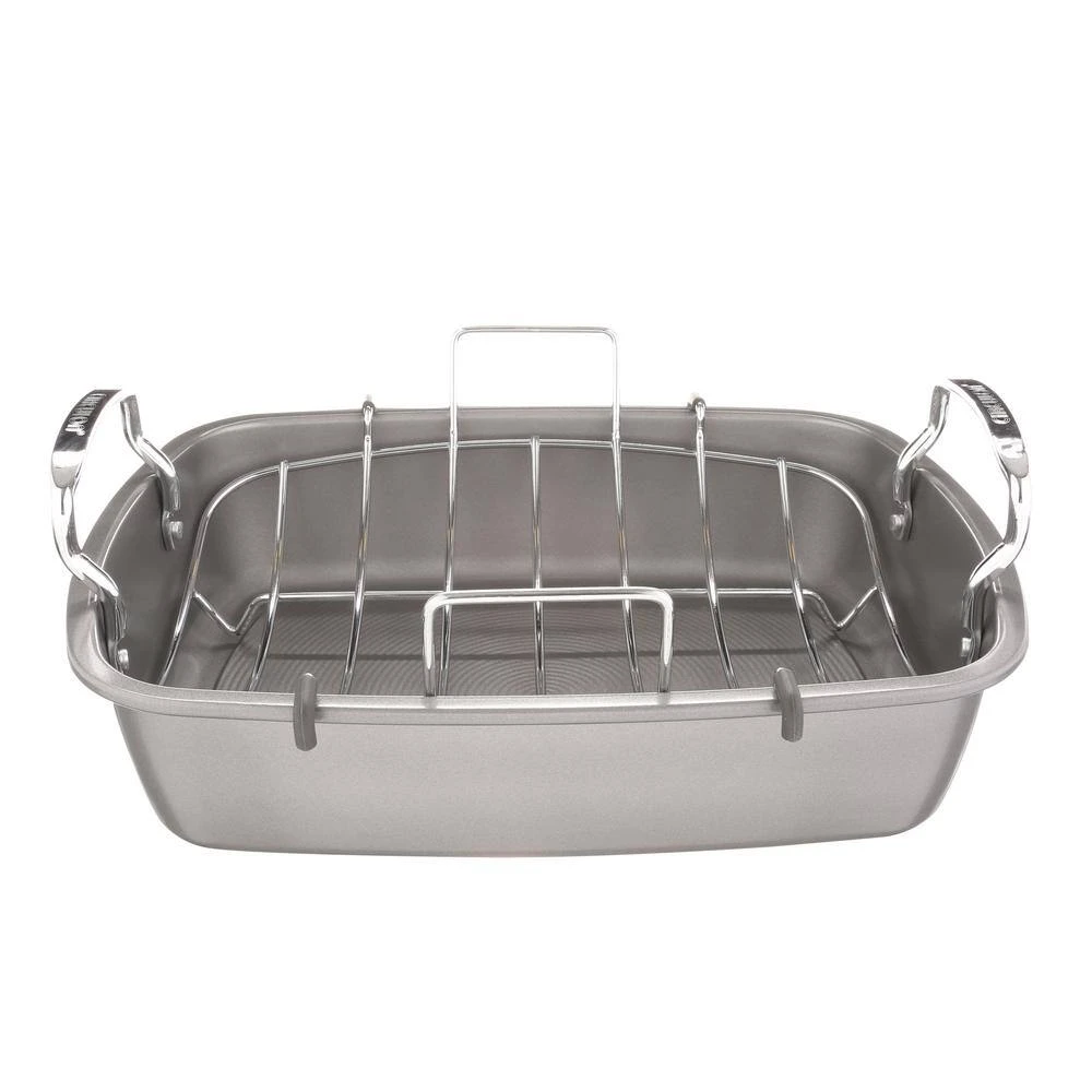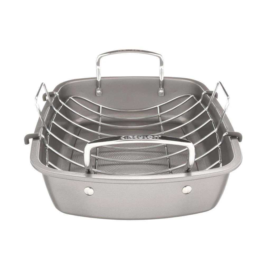 The Circulon Nonstick Bakeware 17 in. x 13 in. Roaster with U-Rack makes it simple to create healthy, lean and mouthwatering dishes, from a maple-and-cider-brined turkey to a pork loin roast with cranberry chorizo stuffing. With its convenient chrome-plated U-shaped rack, this roaster keeps meats off the bottom of the pan so unwanted fats drip away to the bottom of the roaster. The heavy gauge steel construction promotes balanced heat distribution for superior cooking performance and long-lasting durability while the rolled edges provide extra strength. The roaster also features PFOA-free premium-quality nonstick for excellent food release and easy cleanup. Oven safe to 450°F, this well-proportioned roaster is a great way to create healthier, more delicious meals. Crafted with elegant contemporary design and ready to deliver even more healthy cooking solutions, the roaster coordinates well with many other items in the Circulon Bakeware collection.