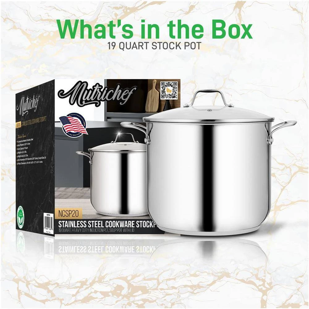 The NutriChef Stainless Steel Large Cooking Pot features 19-quart capacity weighing 7.4 lbs w/ lid which is the perfect size for boiling eggs, simmering stocks and soups or making sauces for a large crowd. Great for commercial and home cooking. Features ergonomic stainless steel handles for comfortable handling and cooking. Offers a stylish and modern design w/ mirror polished exterior and matte polished interior adding an elegant touch that complements your existing cookwares.