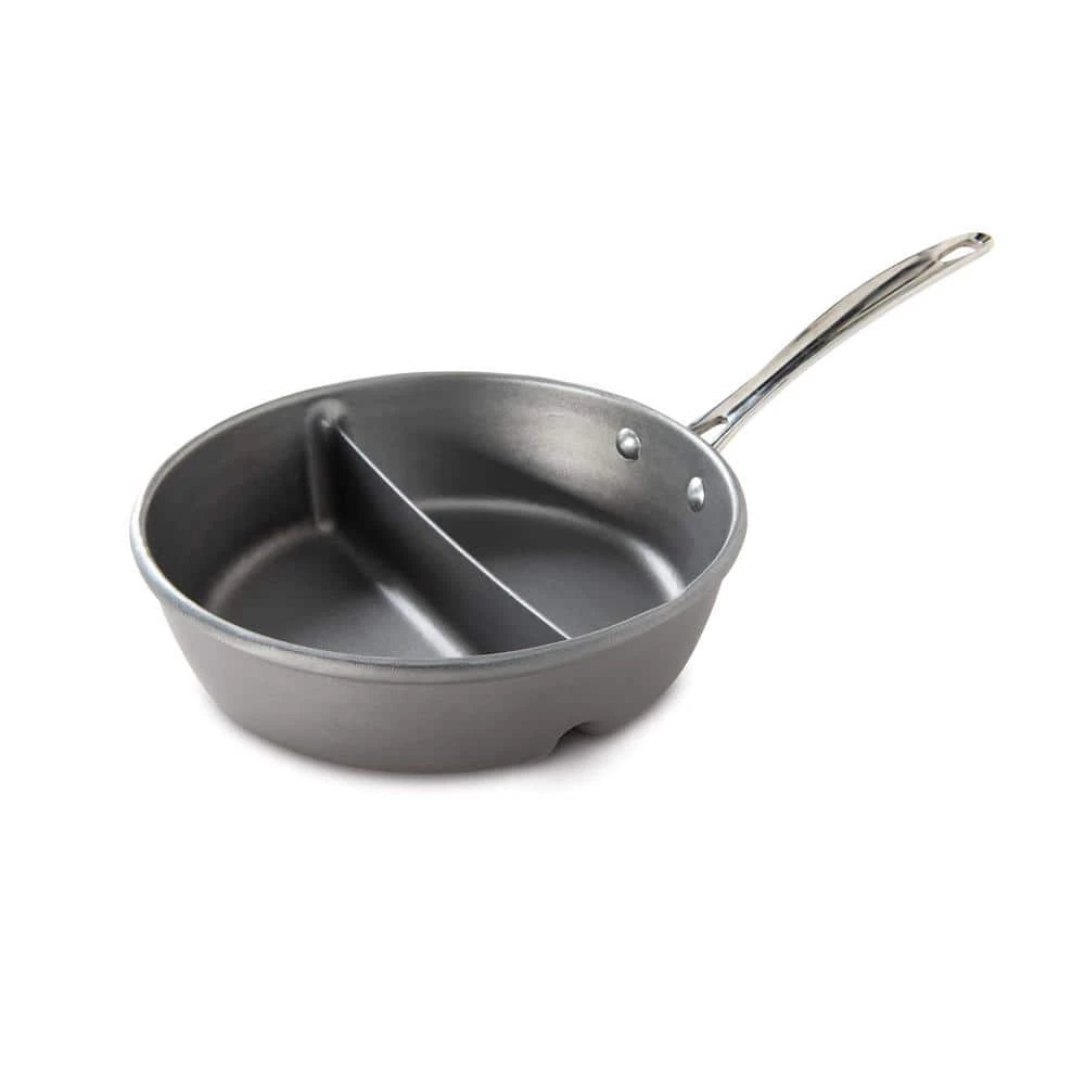 Designed for versatility and efficiency, you can cook two separate foods at once in this innovative, space-saving 2.5 qt. pan. Now one piece of cookware takes the place of two, making it ideal for small kitchens, small households, camping, boating and more. Ideal for reheating leftovers or cooking two different food items. Safe for use on gas, ceramic and electric stoves, it’s also oven safe to 400°F. Though people at all stages of life enjoy owning our divided pans, they’re filling a special niche for the newest generation of cooks who appreciate the space-saving, time-saving, money saving concept of doing more with less. Crafted of cast aluminum with a beautifully balanced and riveted stainless steel handle. Includes PFOA free premium nonstick for easy food release and cleaning. It’s a pot. It’s a pan. It’s both– and it represents quality, durability and sustainability as well.