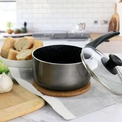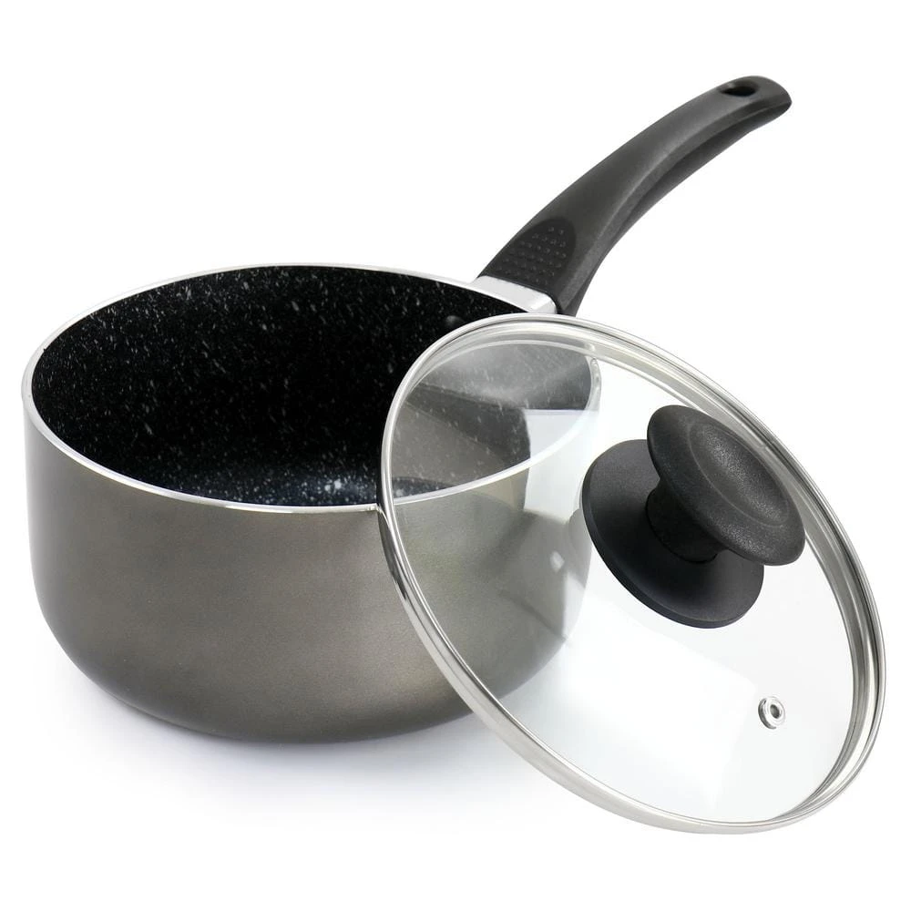 This 2.5 qt. nonstick aluminum saucepan by Oster is the perfect addition to your home cookware. Constructed with durable and long lasting aluminum base with a tempered glass lid. Features Bakelite handles and knob that stay cool while you are cooking for convenient transportation. Lid features a venting hole that releases steam while you cook. Nonstick interior coating for low-fat cooking and easy clean up.
