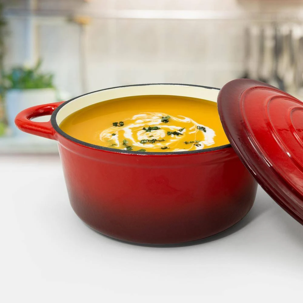 Made of high quality cast iron with a beautiful enamel finish, this cookware looks great in the kitchen or on the dining room table. Whether its a slow-simmered flavorful stew, a lovely lasagna or a comforting cheesy potato casserole this heavy duty pan can fulfill all of your home cooking needs. The cast iron design delivers superior heat distribution and the enamel coating provides a hassle-free non-stick coating. Can be used on the stove, in the oven or for storing leftovers in the fridge.