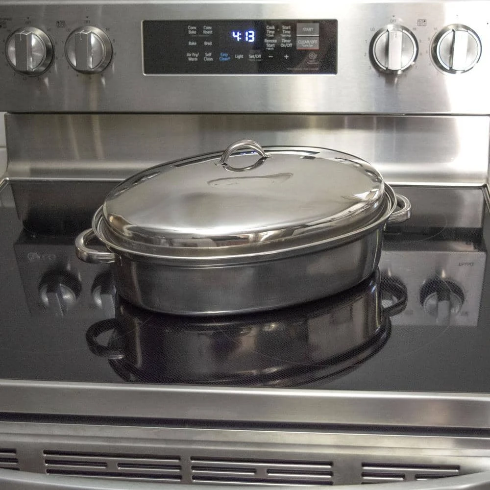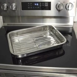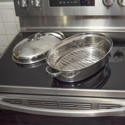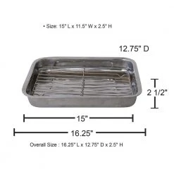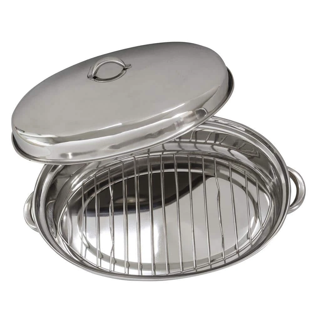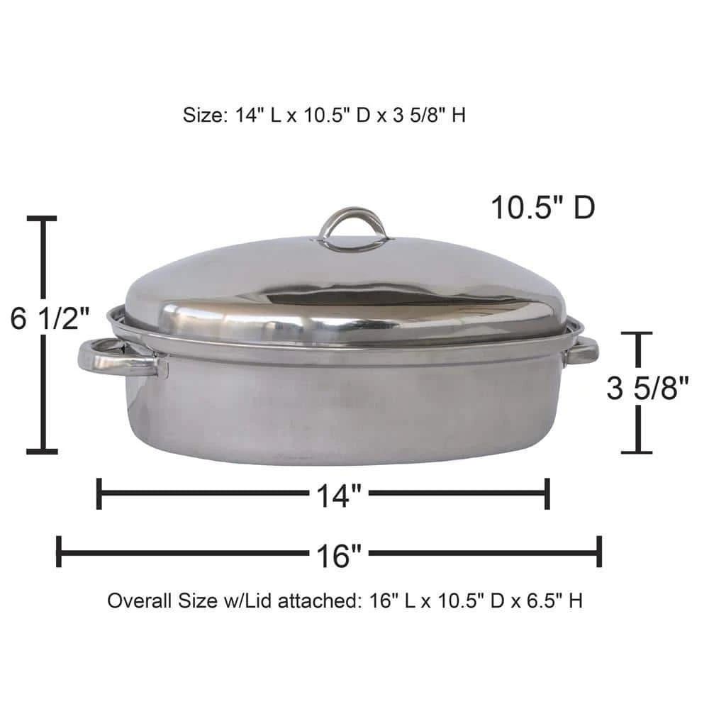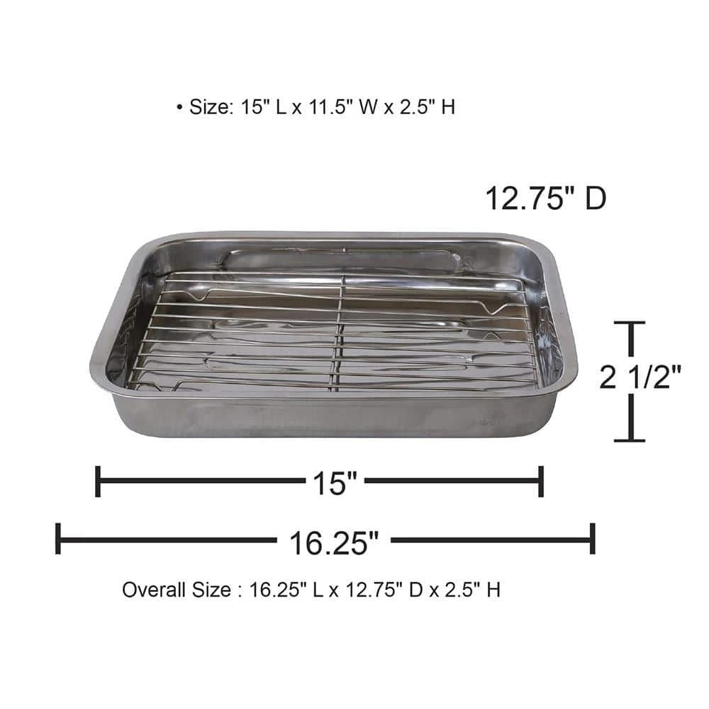 Prepare a delicious meal with the AmeriHome 5 Piece Stainless Steel Roasting Set. An Oval Roaster with matching lid and wire grate, and one Baking Tray with matching wire grate are constructed of 202 grade stainless steel, which conducts heat well, plus it is tough and long lasting. Ideal for the campsite, or as an extra set of pans in the trailer or RV. The stainless steel construction also makes this set dishwasher safe, so clean-up is simple. Wire racks that fit inside each piece of this Roasting Set help prevent food from burning and trap the drippings from roasts, whole chickens, or small turkeys. One Oval Roasting Pan with fitted lid and wire grate Pot Size: 14 in. L x 10.5 in. W x 3 5/8 in. H in. Pot with lid: 16 in. L x 10.5 in. W x 6.5 in. H Grate Size: 13 in. L x 8 in. W One rectangular Baking tray with fitted wire grate Tray size: 15 in. L x 11.5 in. W x 2.5 in. H Overall size: 16.25 in. L x 12.75 in. D x 2.5 in. H Grate Size: 13.5 in. L x 10 in. D