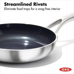 The OXO Mira 3-ply stainless steel collection is high-performance tri-ply built for modern kitchens. This non-stick frying pan set has the tools you need to make early morning eggs, a quick lunch and a full family dinner. Each piece is crafted with 2 stainless steel layers and a heat-radiant aluminum core to deliver fast and even cooking. A stain-resistant finish on each exterior prevents heat discoloration. The powerful ceramic non-stick coating is infused with diamonds to deliver remarkable non-stick ease. Plus, the ceramic non-stick coating is free of PFAS, PFOA, lead and cadmium. Lightweight, contoured stainless steel handles keep cooking comfortable while the streamlined rivets eliminate food traps for a seamless, snag-free interior. The durable, all-metal construction is perfect for all stovetops, including induction and can move directly from the stovetop to oven or the broiler. The tri-ply Mira collection is dishwasher safe for quick and easy cleanup. Oven safe up to 600ËšF.