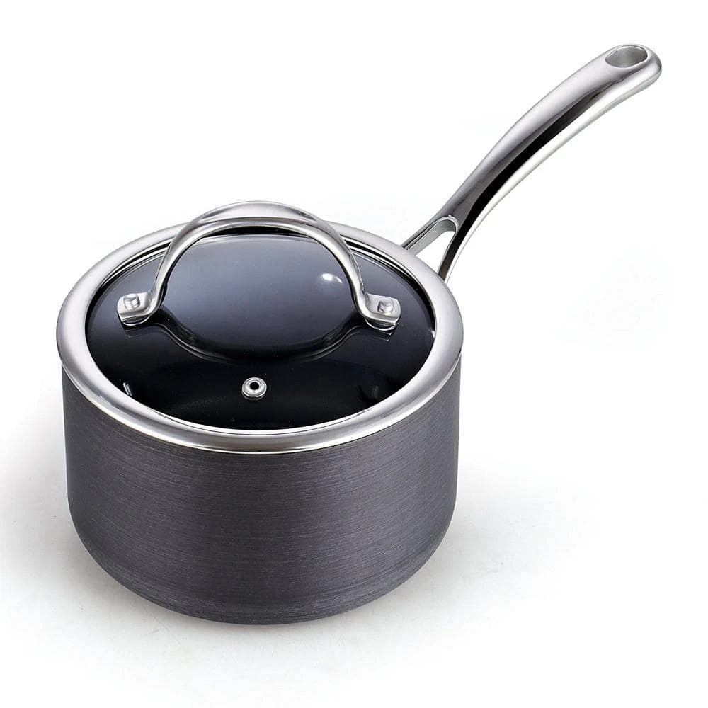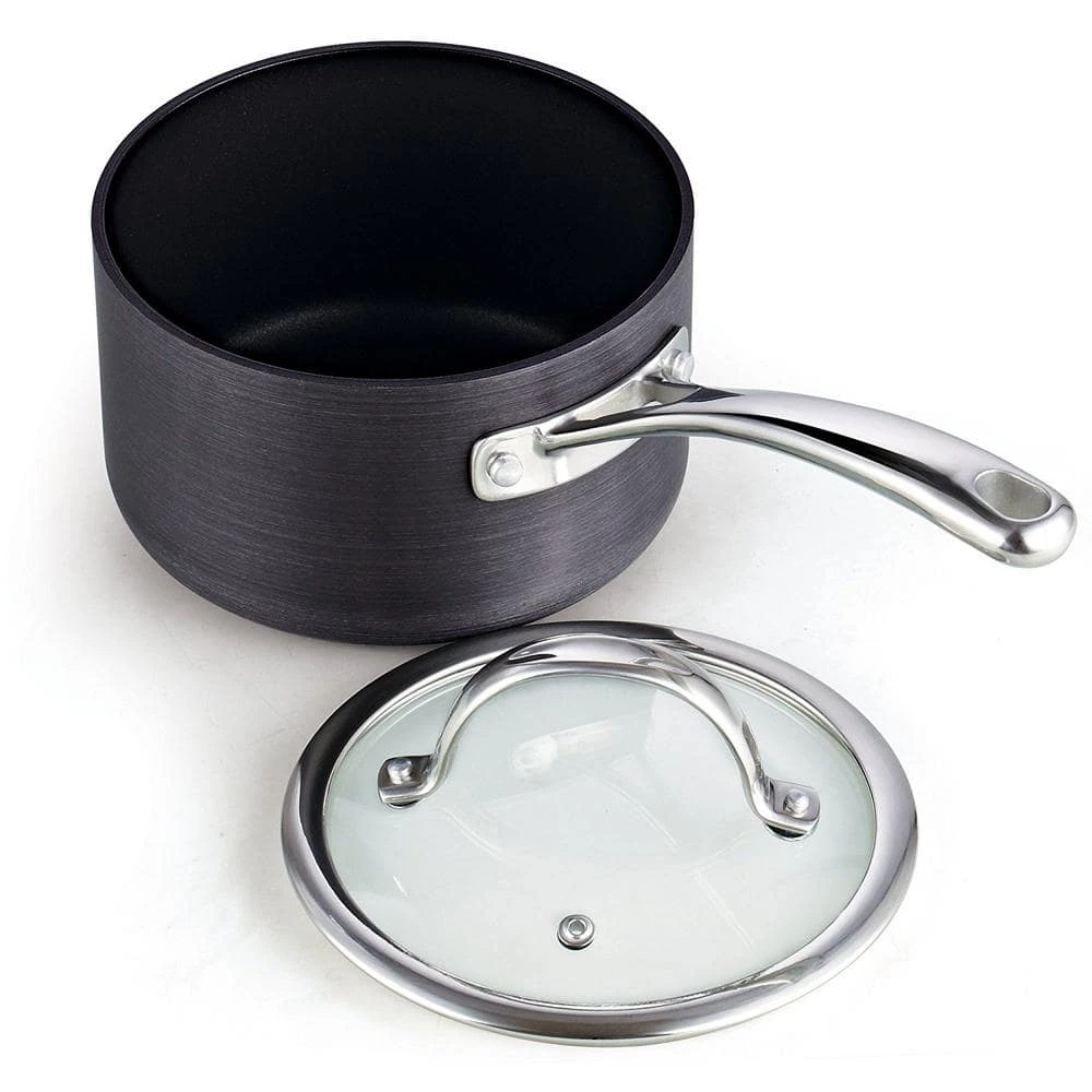 The Cooks Standard 2 Qt. Nonstick Hard Anodized Saucepan with Lid has a hard anodized surface is harder than stainless steel, dense, and chip-resistant. The Heavy-Gauge aluminum core provides even heat distribution and prevents hot spots. Nonstick delivers exceptional performance, makes food release/cleaning easy, and allows for healthy cooking. Tempered glass lid with steam vent is protected by a stainless steel rim. Riveted stainless steel handles for strength stay cool and are comfortable. Not Induction compatible. Works on gas, electric, glass, ceramic, halogen, etc. Oven safe to 450°F, glass lid is not oven safe. Hand wash recommended, not dishwasher safe.