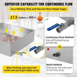 - Efficient Processing Flow: Handle nearly 17.5 gal. of sap in total, meaning 265 bottles of 0.07 in. maple syrup can be made. The maple syrup pan comes with a 3/4 in. valve to adjust the flow rate and load the maple syrup into other containers