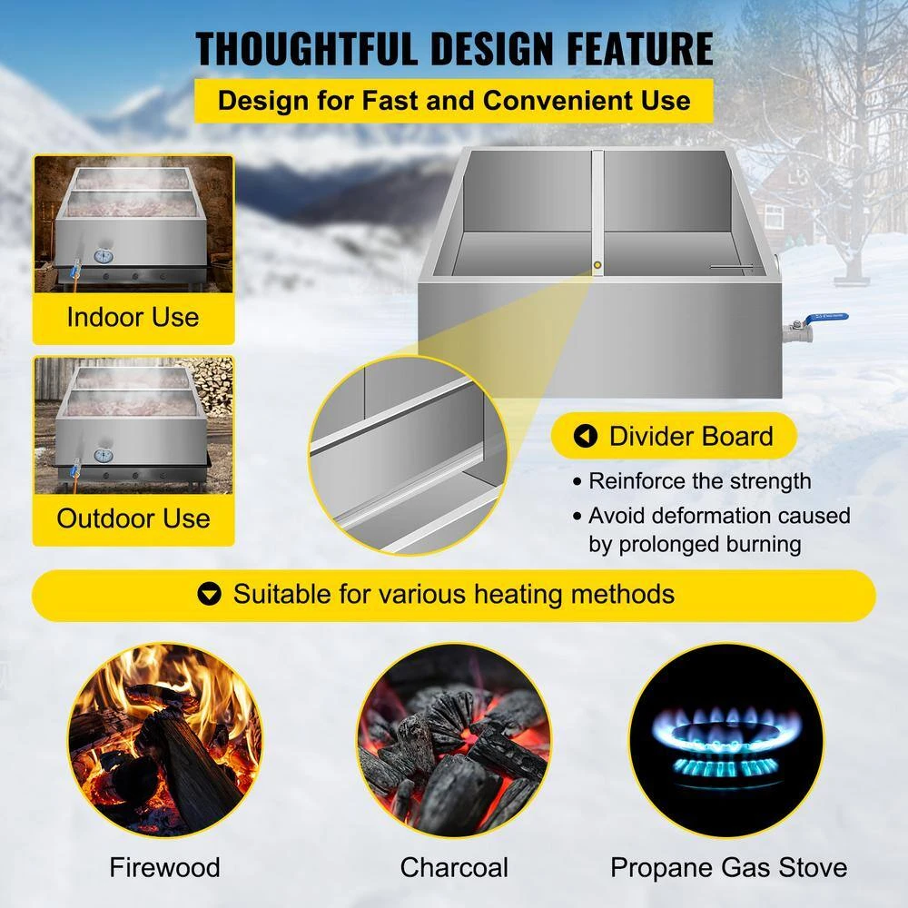 - Outdoor & Indoor Use: This syrup pan is suitable for outdoor or indoor use, and supports many heating fuels: firewood, charcoal, propane gas stove, etc. The addition of a divider board can reinforce the strength to avoid deformation after burning for too long