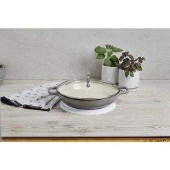 The enamel cast iron braiser from MasterPRO has been designed to meet the culinary goals of every cook. This versatile pan can braise ribs, roast poultry, slow-cook gravies, fry chicken, bake dessert, and everything in between. The transparent glass lid and light-colored enameled interior allows for easy monitoring of the cooking process, so your results are always perfect. Cook up a storm in the kitchen then take the braiser to the table for a beautiful meal presentation.