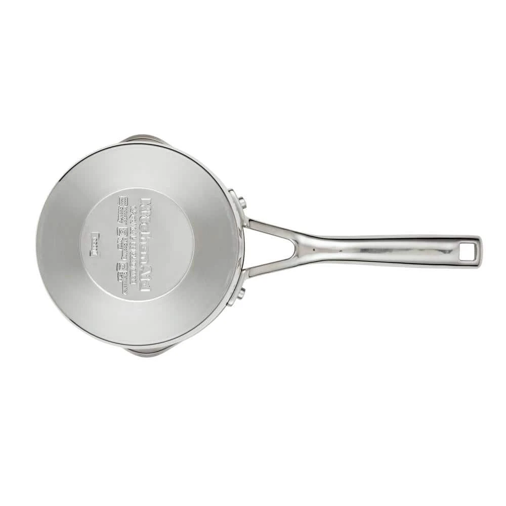 Experiment with and discover new flavors and techniques when cooking with the KitchenAid 3-Ply Base Stainless Steel Saucepan, designed with an extra thick layer of heat-conducting aluminum to eliminate hot spots by distributing heat evenly from edge to edge. Heavy-gauge stainless steel pan features a heavy bottom base for lasting durability, and has etched measuring marks to explore and test ingredients for new recipes. Pour spouts allow for precision pouring of rich, homemade bechamel sauce and savory au jus. Curious cooks can investigate a wider range of recipes in the broiler and oven, where cookware is safe to 500°F.