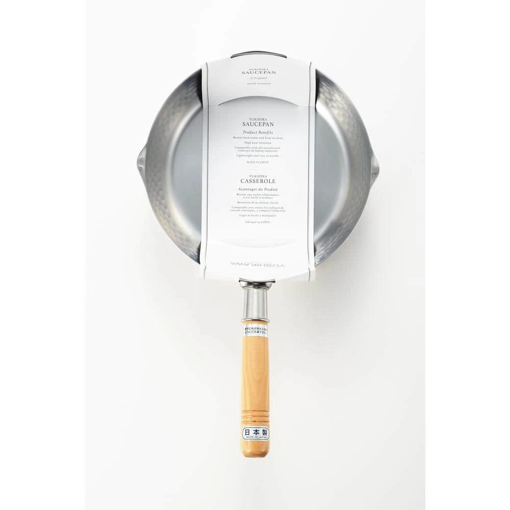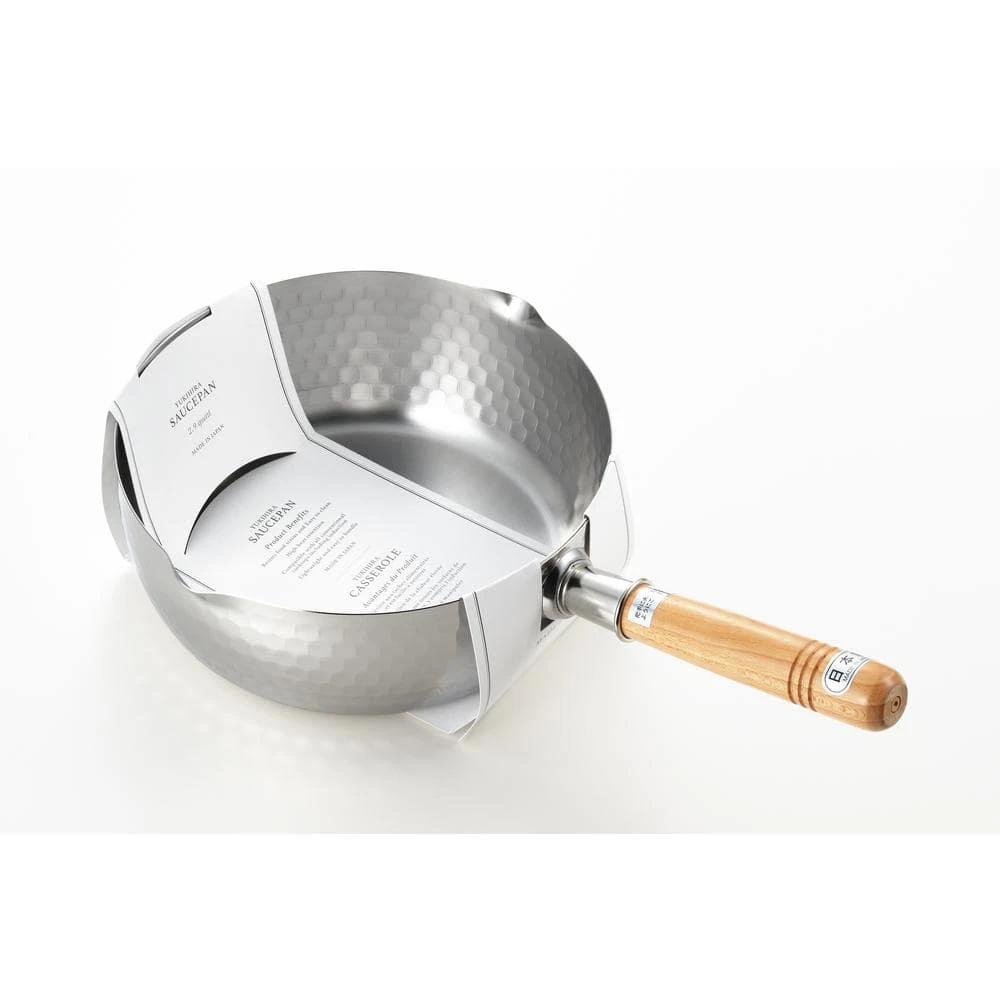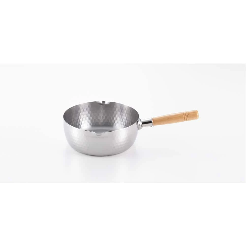 3 qt. Traditional Japanese Yukihira Pot perfect for making noodles, soups, and broths. Light weight, thin walled hammered stainless steel with comfortable beechwood handle. Pouring Spouts on both sides. Lid sold separately.