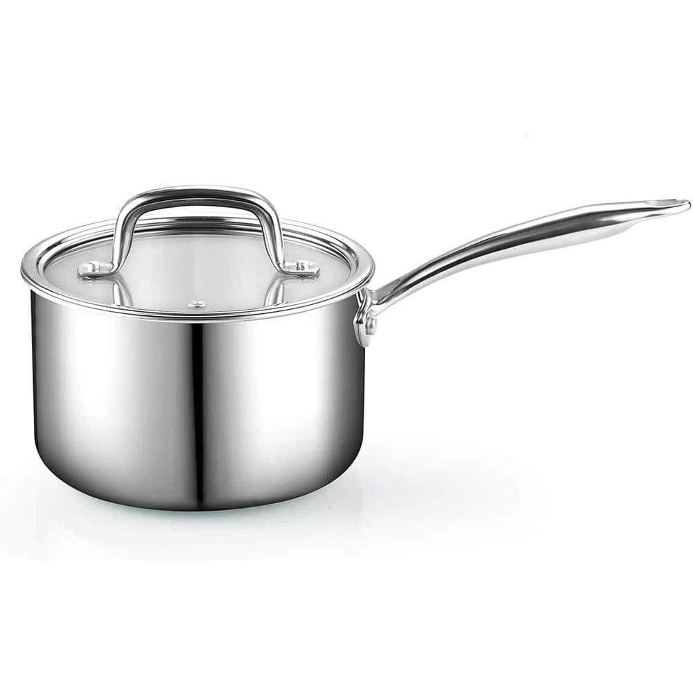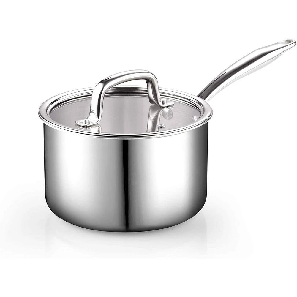 The Cook N Home 02680 Tri-Ply Clad Stainless Steel Sauce Pan with Lid 3 qt. sauce pan comes with a tempered glass lid with steam vent to view food and keep heat/moisture in and a riveted handle for strength. The Tri-ply Clad metal construction is made of 18/10 stainless steel with an aluminum core creating a permanent bond of metal allowing heat to pass through the whole pan-along the bottom and up. This pan works on all stove tops.