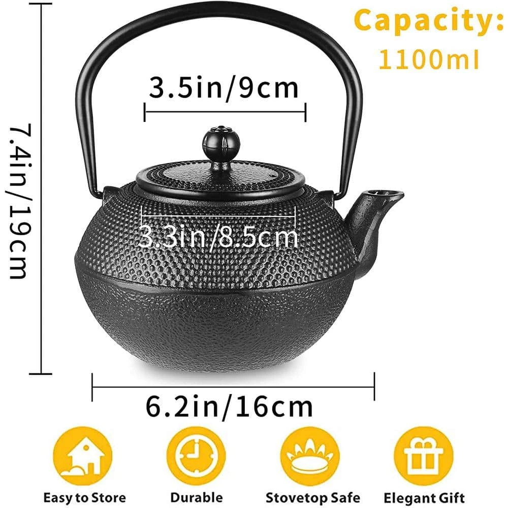 - Package includes: 1-cast iron tea kettle, 1-stainless steel, infuser 1-teapot warmer