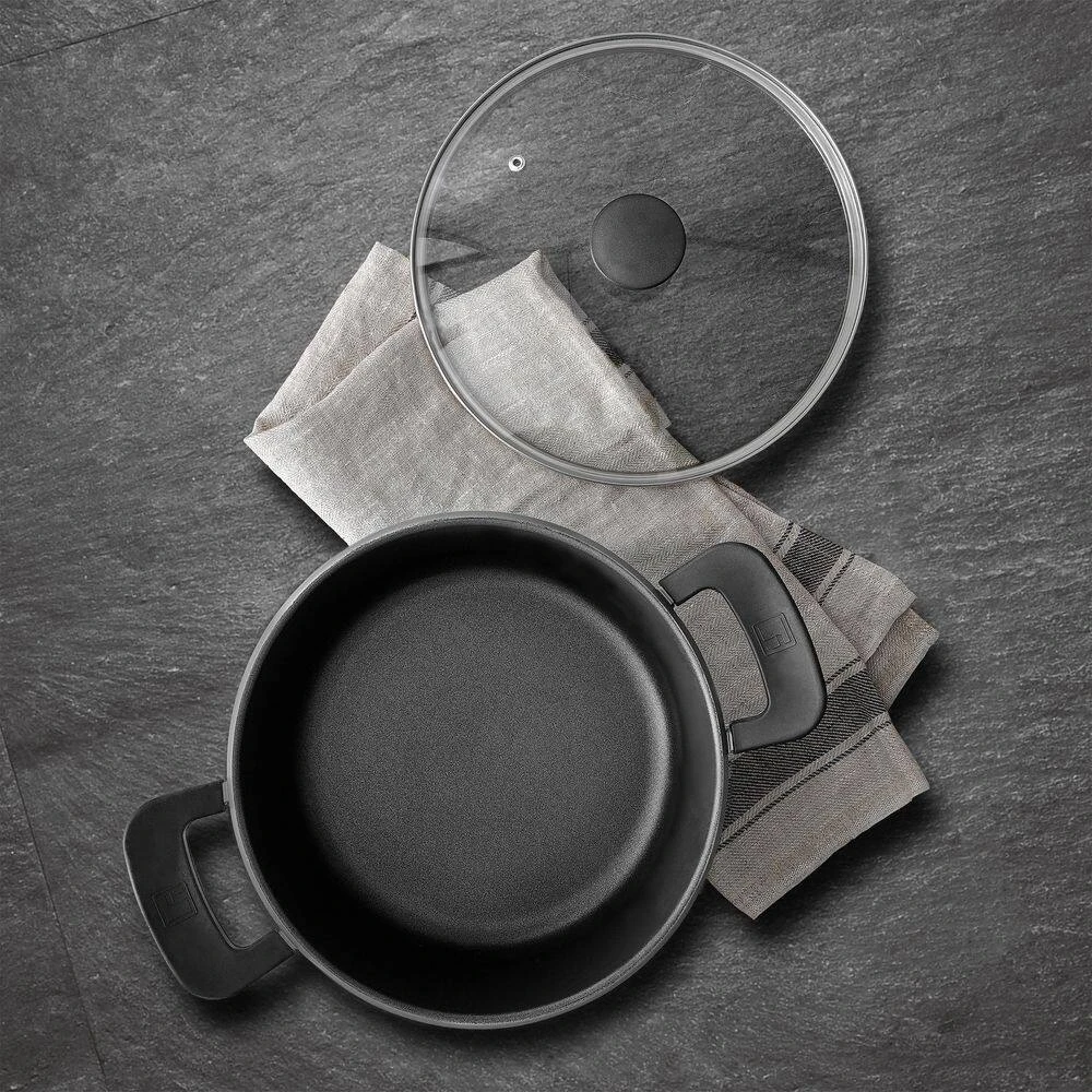 - All Heat Sources – Cookware is oven safe up to 350F. Cast aluminum pans are suitable for all stove types, including induction.