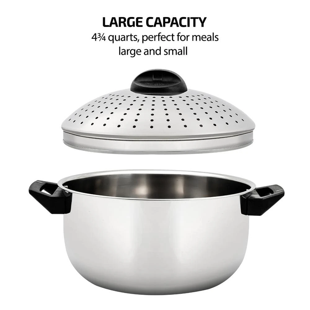 - Large Capacity and Premium Material – 4¾-quart capacity is a perfect size for meals large and small. It is constructed of food-grade stainless steel with polished finish for safe, long-lasting performance with elegant and timeless look. Great at retaining heat.