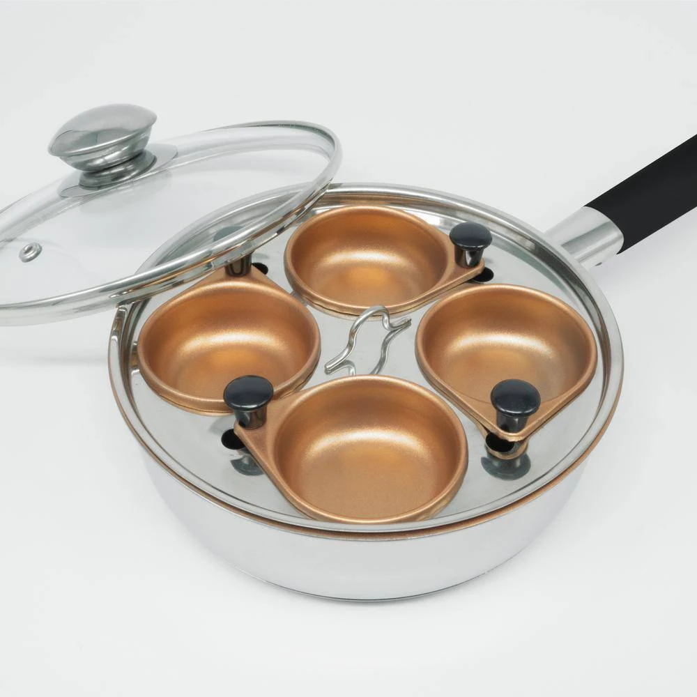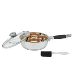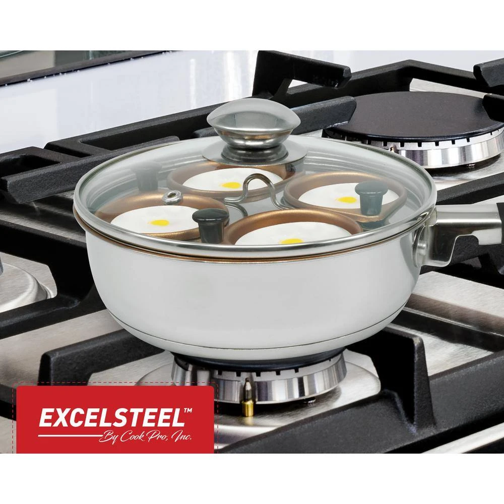 Take the strain out of poaching the perfect egg for breakfast with ExcelSteel’s bestseller, 4 cup professional stainless steel egg poacher. Designed with a vented lid and non-stick egg cups, this egg poacher is easy to clean and use every time. Built with an encapsulated base, a riveted silicone covered handle, and a rust-resistant stainless steel. Impress your friends and family with a wonderfully cooked weekend brunch. Also doubles as a 2.5 Qt saucepan. Included is a FREE silicone spatula to get started the day it arrives. Dishwasher friendly and induction ready.