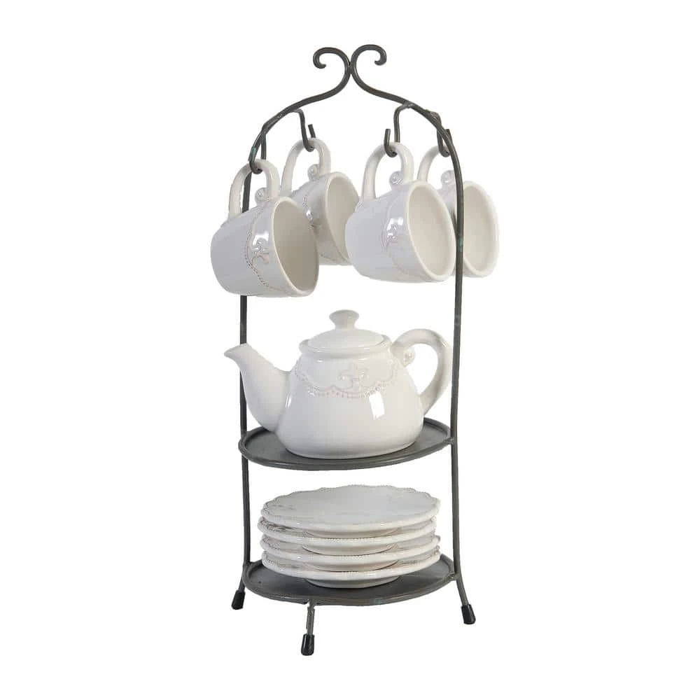 Enjoy a steaming cup of tea with the ten-piece Louis Fleur-de-lis Tea Set with Stand. with a gleaming white finish, delicate beading, and elegant pattern, this tea set showcases all the loveliness of a proper tea plus the convenience of dishwasher-safe clean up. When not in use, this set looks beautiful displayed in its dark bronze stand atop a sunroom table or on an airy kitchen countertop.