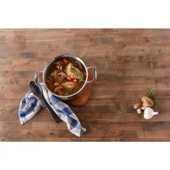 NUCU 5-ply brushed stainless steel stock pots, available in 4 qt., 9.5 qt. and 14 qt. sizes, are perfect for simmering vegetables or meat stocks, slow cooking soups, chili and stews, and boiling pasta. These pots heat evenly, are induction ready, and can stand up to years of heavy use in your home kitchen.